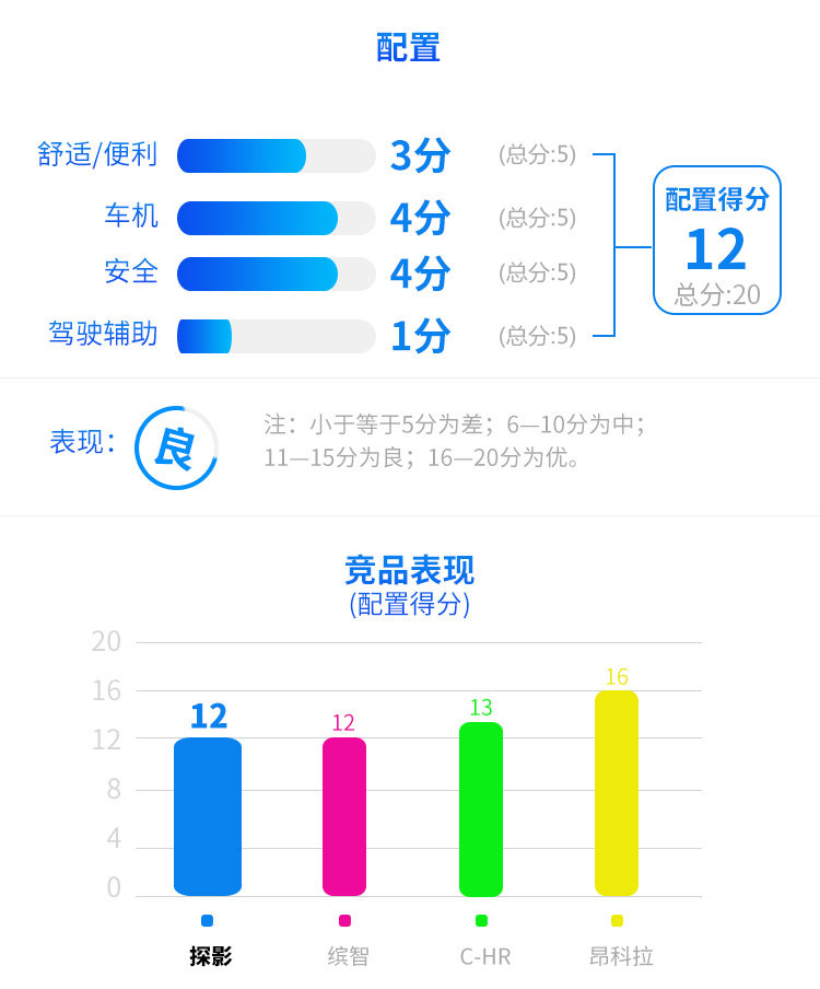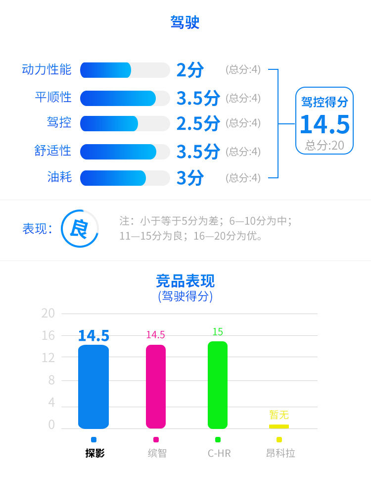 空间小结:探影作为文中参与对比的同级车型中轴距最长的一款,其乘坐空间并没有让教授失望,充裕的头部空间以及后排座椅两侧较长的座垫让后排乘坐体验得到提升,虽然它的尾厢尺寸略小,且车厢内设置的储物格数量较少使它无法在储物能力方面获得高分,但单从乘坐空间考虑,探影无疑是领先大部分同级对手的。