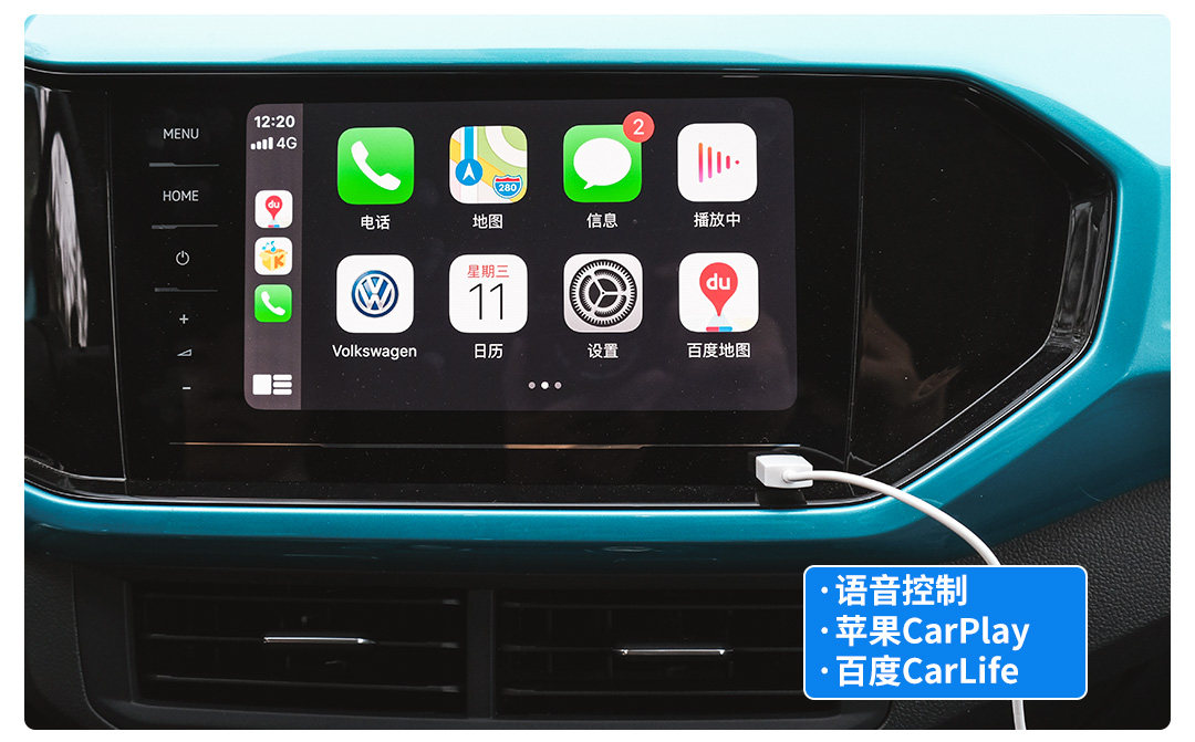 探影 280TSI DSG 悦Pro的车机采用了一块8英寸中控触控屏,操作系统的UI设计比较简约,菜单设计简单明了,上手难度不高。大众还为探影全系标配了苹果CarPlay和百度CarLife,用户可以通过中控屏右下方的USB接口非常方便地实现手机与车机的互联。不过,这款车机在语音控制、联网应用方面的表现仍略显不足,可通过语音控制的仅有导航、电话等几个基础功能,也不支持车联网及OTA升级。