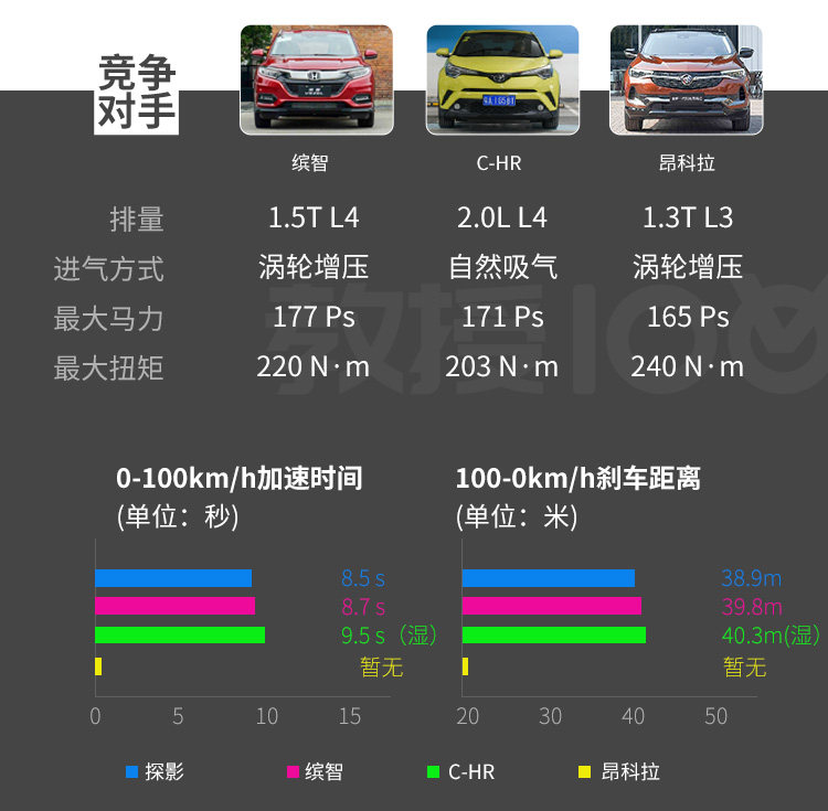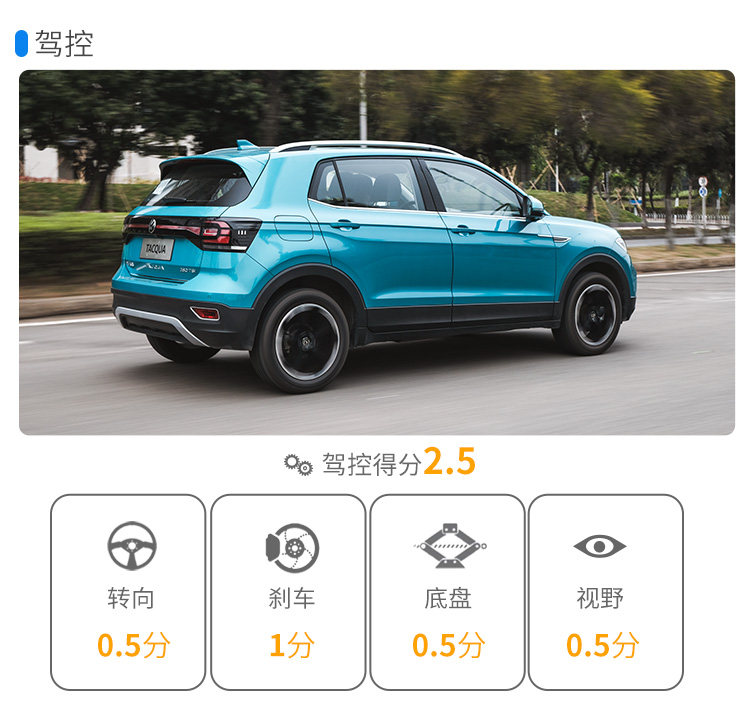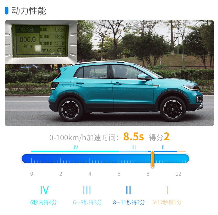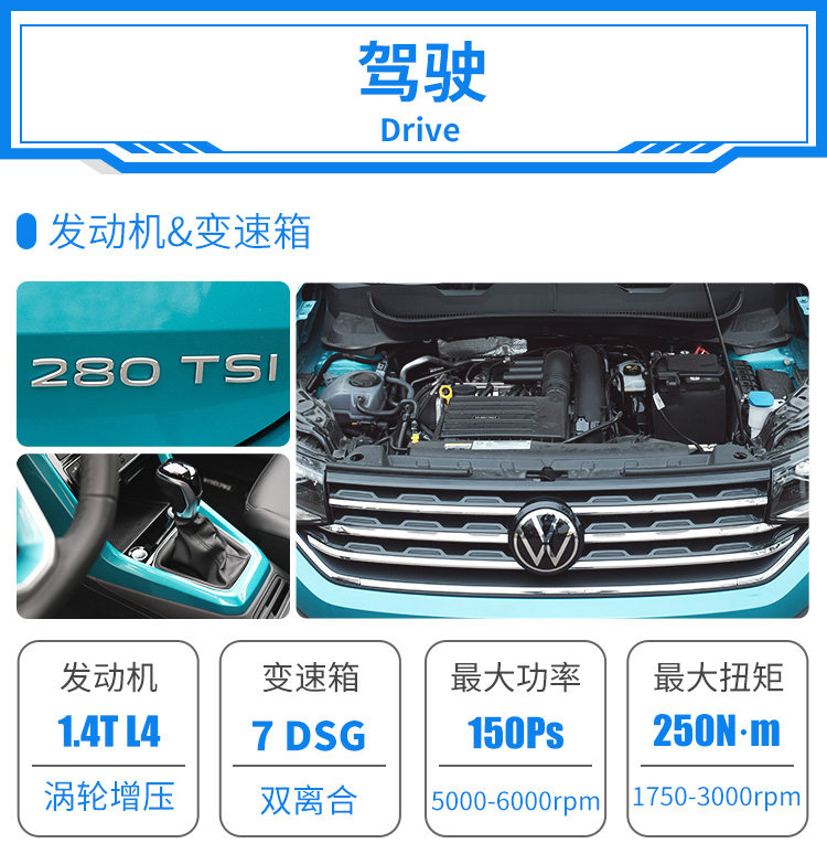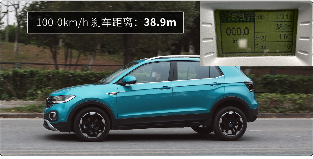 探影280TSI DSG 悦Pro搭载的1.4T涡轮增压发动机+7 DSG双离合变速箱动力系统在大众车型中十分常见,150匹最大马力、250牛·米峰值扭矩的动力参数虽然在竞争对手面前显得“弱小”,但实际测试中,体重仅1.3吨的探影跑出了0-100km/h 8.5秒的好成绩,同样得益于这种体重优势,探影的100-0km/h刹车距离也仅为38.9米。