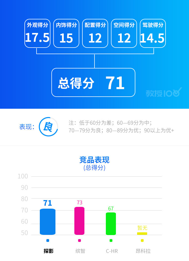 综合看来,探影在外观与内饰设计方面确实是有着相当出色的表现,轻盈的转向和低至5.1L/100km的油耗也让它成为一款非常适合城市通勤的小型SUV,尽管在驾控乐趣和科技配置方面略显不足,但是教授认为对于大部分以日常通勤作为主要用车需求的年轻消费者来说,探影确实是一个很不错的选择。