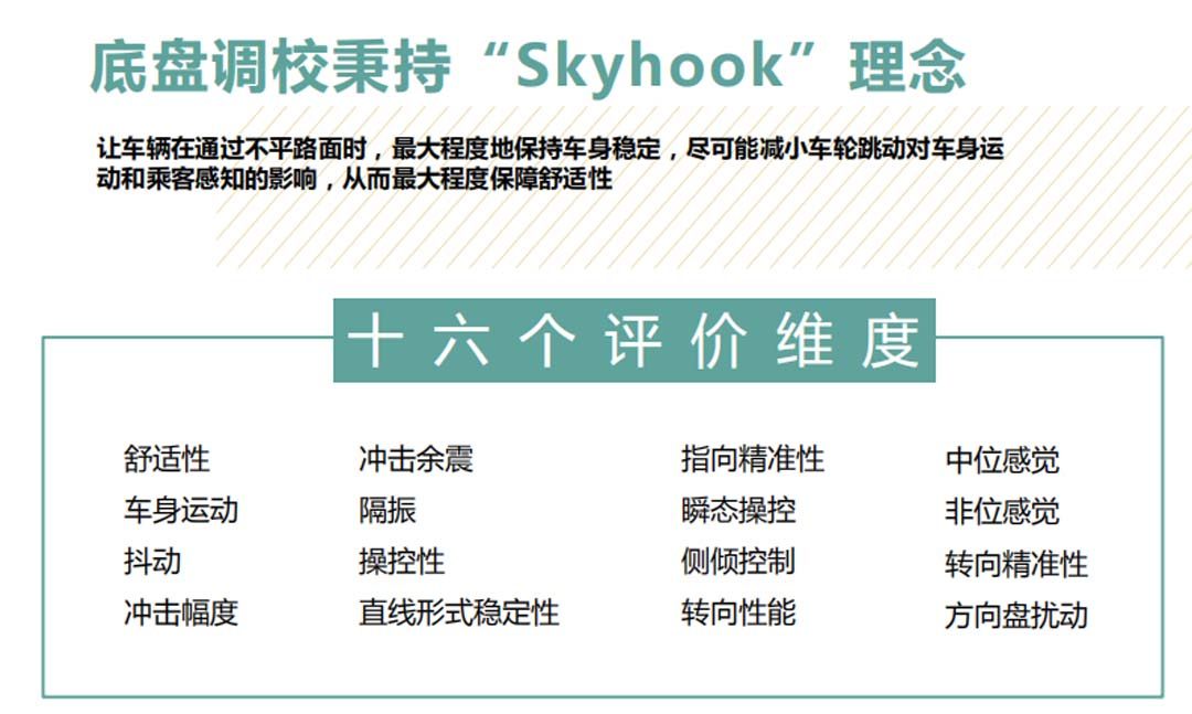 1、兼顾操控的同时,主打舒适性,调校方面秉持“Skyhook”理念,从16个评价维度进行评估,最大程度地保障底盘的舒适平顺。
