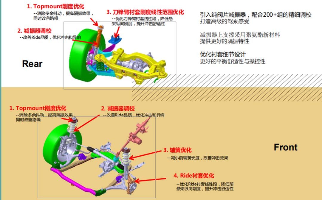 2、通过对前/后Topmount、Ride衬套、减震器、弹簧等零部件的优化,改善冲击、提高舒适性。