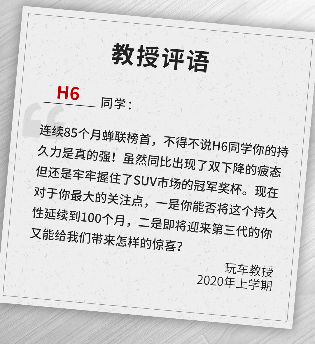 85个月的销量冠军,不是闹着玩的,看来我是没选错,加油h6。