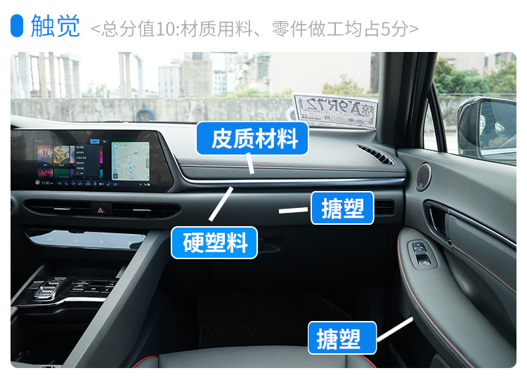 从视觉效果上来看,索纳塔的内饰十分高级。但是上手摸过之后,会发现索纳塔的内饰用料是以硬塑料和搪塑为主。好在索纳塔在门把手这些人体经常触碰到的地方依然包裹了皮质。
