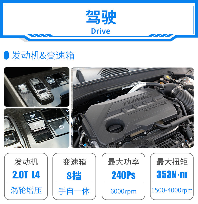 索纳塔380T采用的是现代旗下的2.0T涡轮增压发动机,具有直喷、可变进气歧管、电控泄压阀等技术。这款发动机没有用上最先进的CVVD技术,不过240匹马力和353牛·米扭矩的账面数据称得上第一梯队。