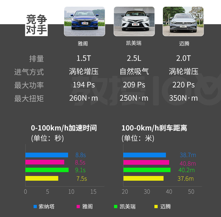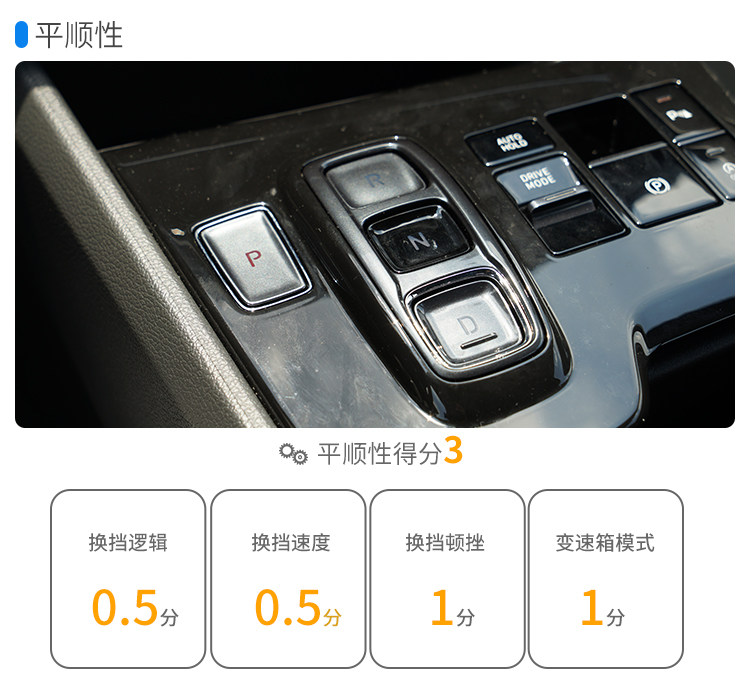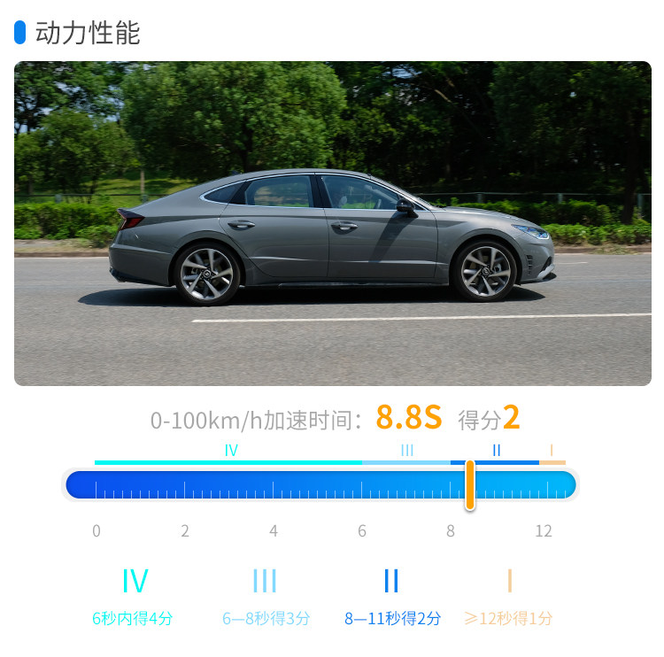 小结:第十代索纳塔动力和底盘都能给人惊喜。索纳塔十的动力在日常使用中十分讨喜,动力释放线性易控,日常跟车和市区超车都很从容,变速箱调校平顺,基本上是感受不到换挡的动作。索纳塔的底盘可以说是这一代B级车中最平衡的一位,凯美瑞比它稍软一分,对弹跳的抑制不如索纳塔,雅阁太硬,舒适度又稍欠一筹,迈腾又略微清脆,厚重感不如索纳塔。当然,第十代索纳塔在隔音方面还需要稍微补足。
