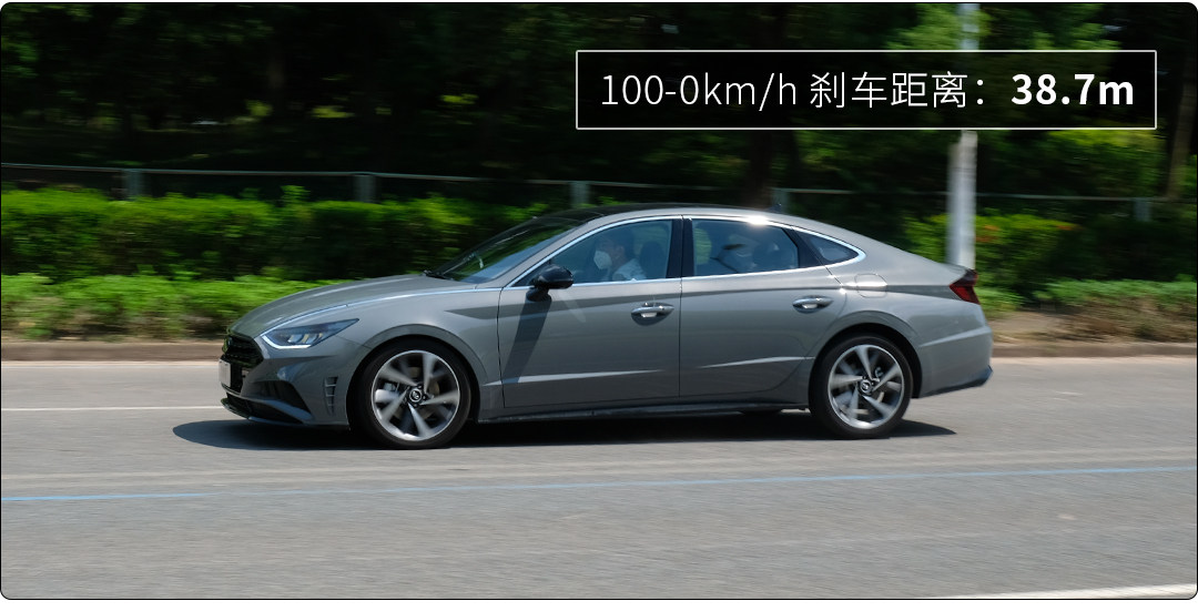 索纳塔配备的是米其林PRIMACY 4系列轮胎,规格为245/40 R19,这套轮胎主打静音和舒适性能。这套轮胎能够在索纳塔身上获得如此好的成绩还是得益于i-GMP平台低重心的优势,使得刹车点头现象并不严重,最大程度地利用四条轮胎的抓地力。