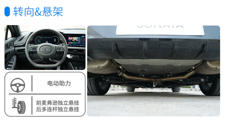 第十代索纳塔采用了前麦弗逊后多连杆的悬挂结构,这种结构在B级车上比较常见,所以第十代索纳塔的表现如何,关键还是看调校。第十代索纳塔的底盘厚重感和高级感有了质的提升,扎实厚重但并不生硬的底盘质感非常讨喜。