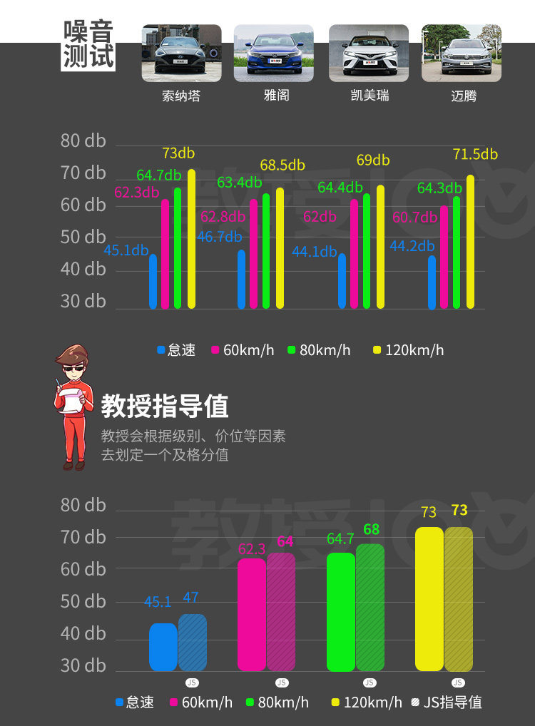 虽然索纳塔虽然采用了双层隔音玻璃,外观看上去也符合低风阻车型的特征,但是在120km/h的时速下,它的风噪十分明显,和竞争对手有一定的距离。而在中低速的情况下,索纳塔的静音水平跟竞争对手相差无几。