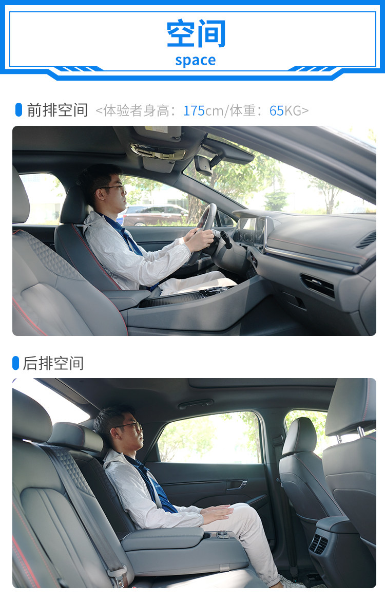 第十代索纳塔的乘坐空间对于1米75的人来说十分大,以这个模特为例,前排的头部空间有一拳的空间,而后排头部有四指的空间,腿部有一拳加一掌的空间。第十代索纳塔对空间的处理非常出色,在后排坐垫高度已经有350mm的情况下,通过掏空头顶的位置,做出了940mm的头部空间,但是第十代索纳塔后排中央却没有掏空,相信这里是填充了隔音材料。
