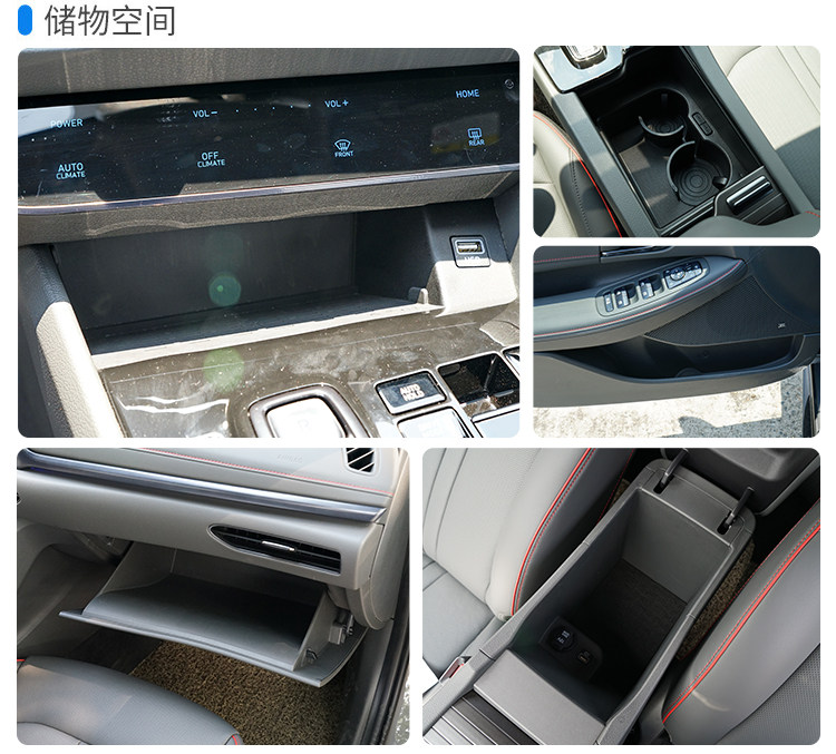 索纳塔十车内的储物空间数量一般,但是每个都够大,实用性好。像门把手有个细窄的储物格,可以放通行卡,手机一类细长的物件,又不同担心他们在晃荡。