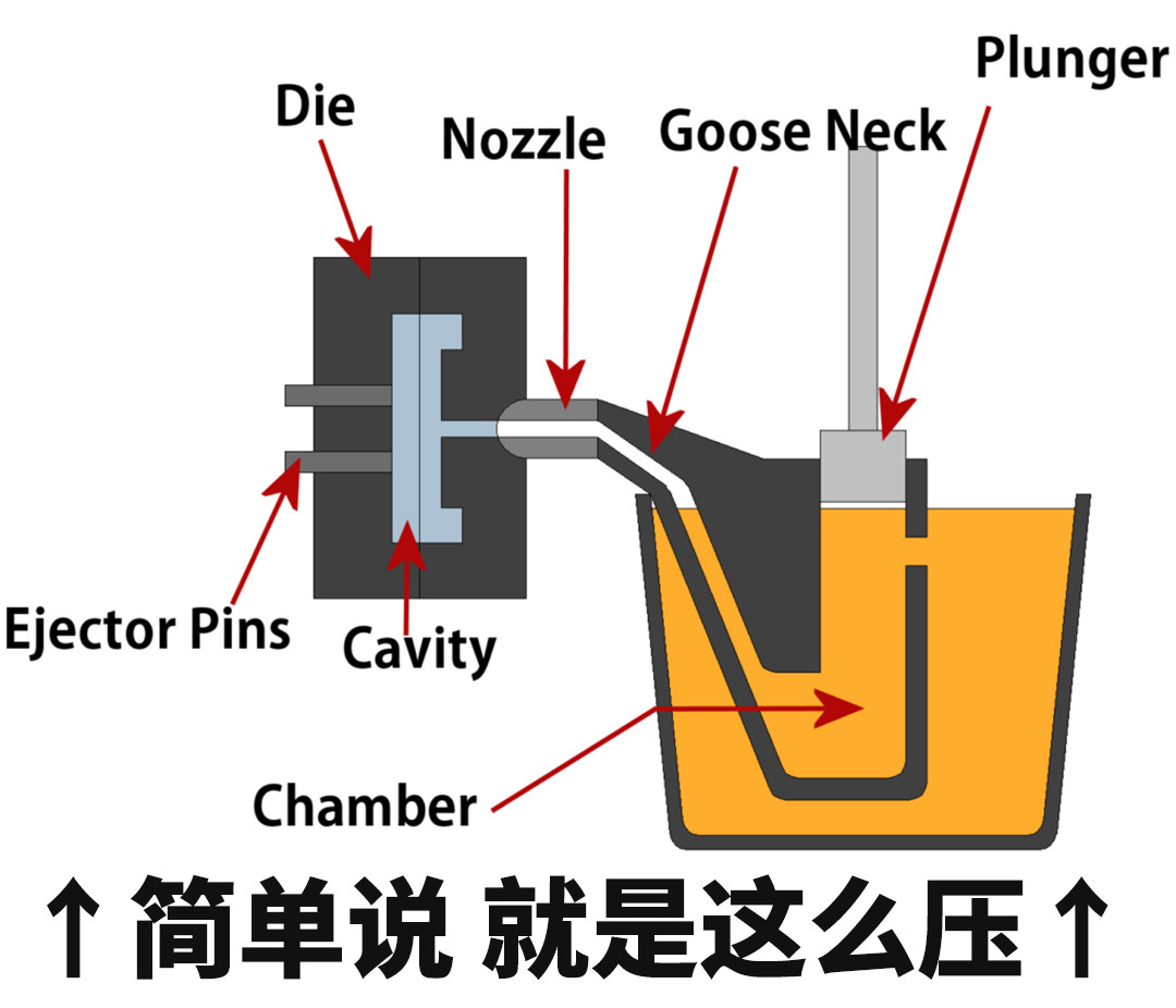 压铸是一种金属铸造工艺,简单来说就是将高温熔化(铝在摄氏660度时会熔化)的金属施加压力,注入到模具中,然后冷却后就可以得到一件零部件。与普通铸造的最大不同在于其模具使用强度更高的合金打造。