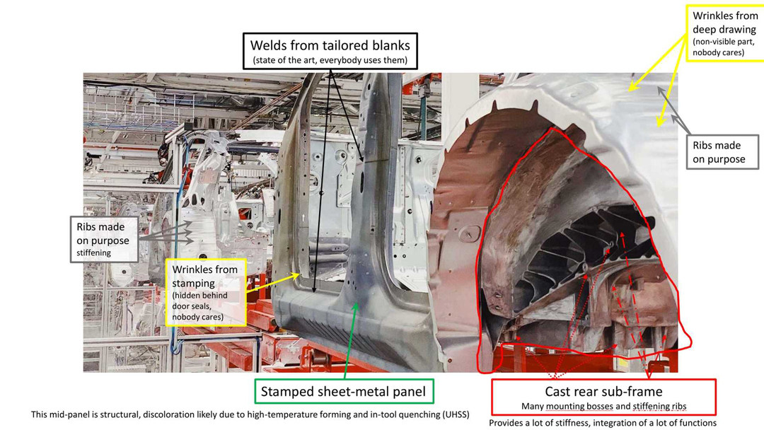 另外,Model Y的后纵梁是开口截面,而一般车使用封闭截面,这同样会造成一定的刚度损失。假如车辆发生追尾事故,铸造零件不会因撞击而变形,而是会变成碎片,其后期维护成本会不会增加?