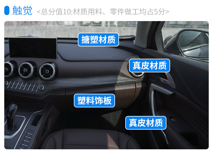 VV7科技版内饰的触感依旧保持一流的水准,中控台上部分采用的搪塑材质也比较软,中控和门扶手处采用了真皮材质,手感细腻。