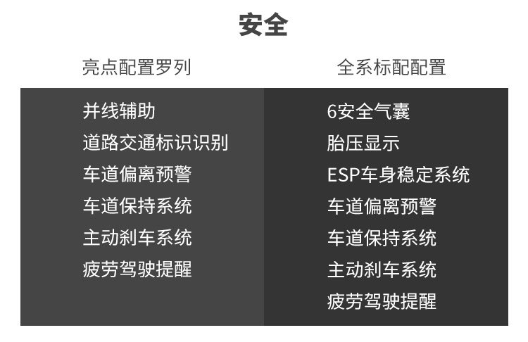 全系标配AEB主动刹车系统也比较厚道,高配车型上还有并线辅助、道路交通标识识别等配置,安全上让人放心。值得一提的是,语音是不能控制这些辅助系统的,必须由你自己在屏幕上进行控制。
