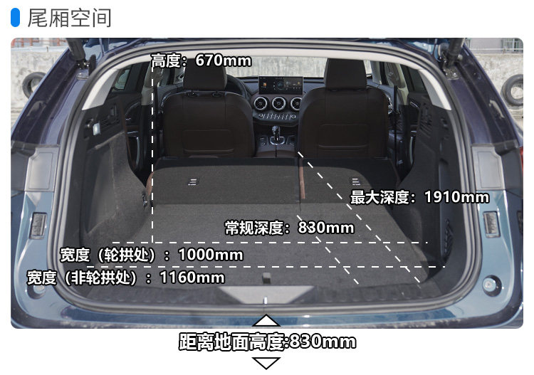 VV7的后备厢非常规整,轮拱凸出幅度并不大,二排座椅可放倒,得到几乎全平的后备厢空间。可惜后备厢的高度只有670mm,限制了它存放大件物品。当然,现在这个后备厢容积对于家庭出游也足够了。