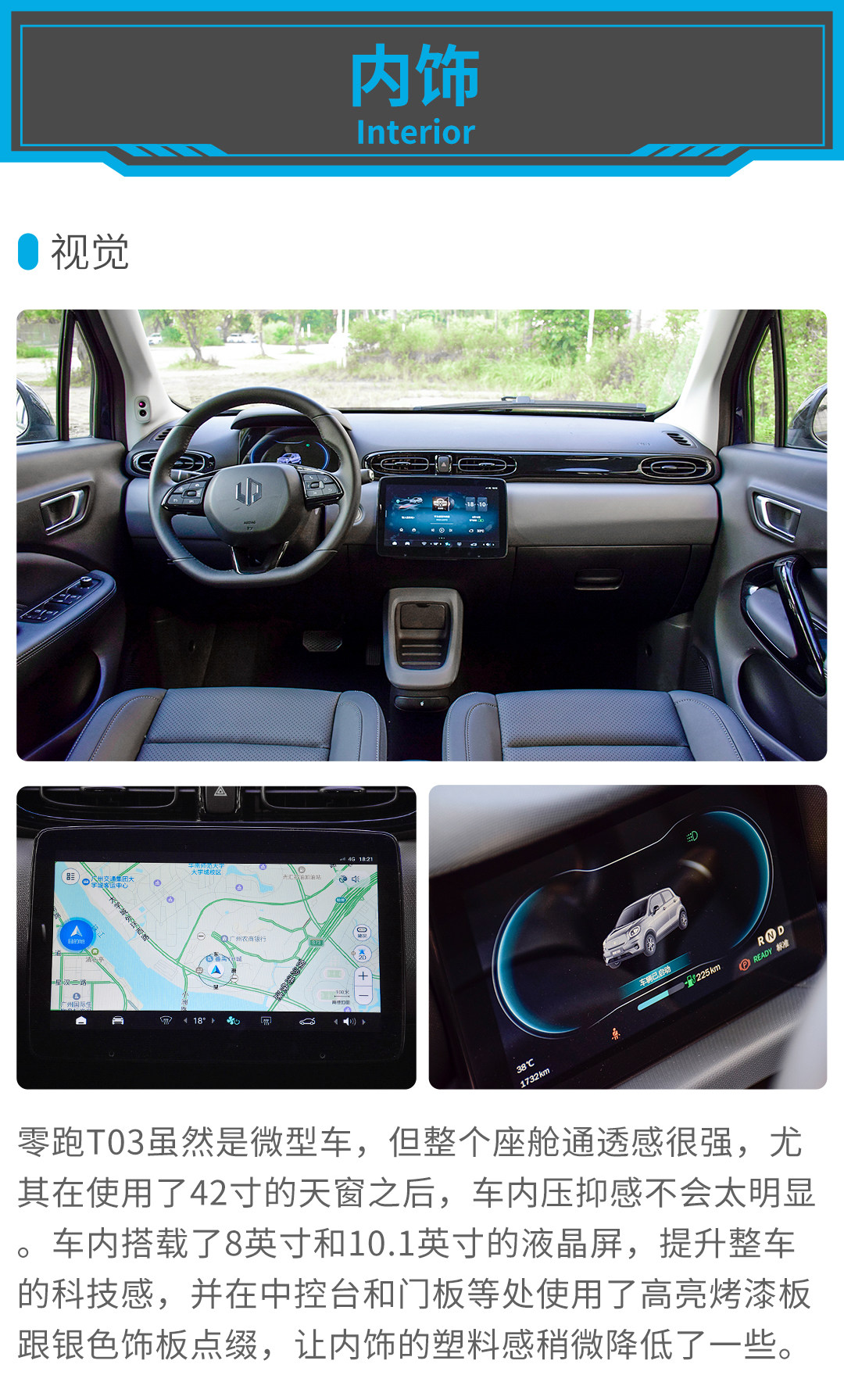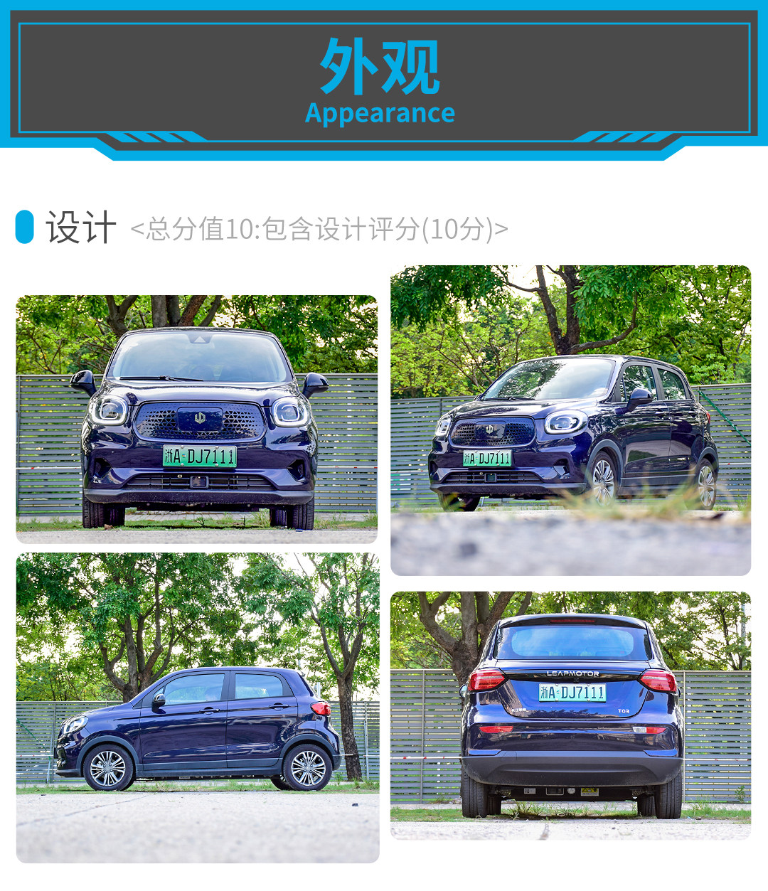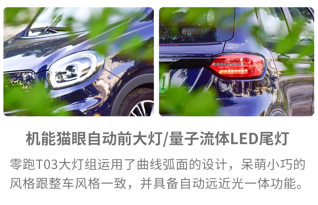 小结:零跑T03并没有因为定位较为入门,就在设计上偷懒,全车大量使用圆滑的线条来修饰,不管是可爱风的大灯,还是三角放射状的前格栅和黑饰条贯穿的尾灯,既强调了萌宠的形象,也凸显了前卫和个性。