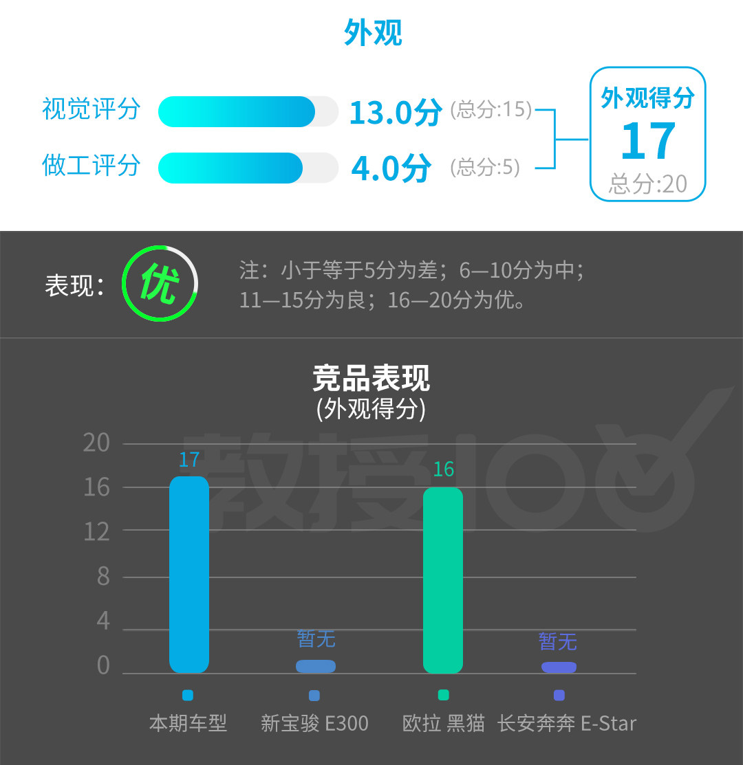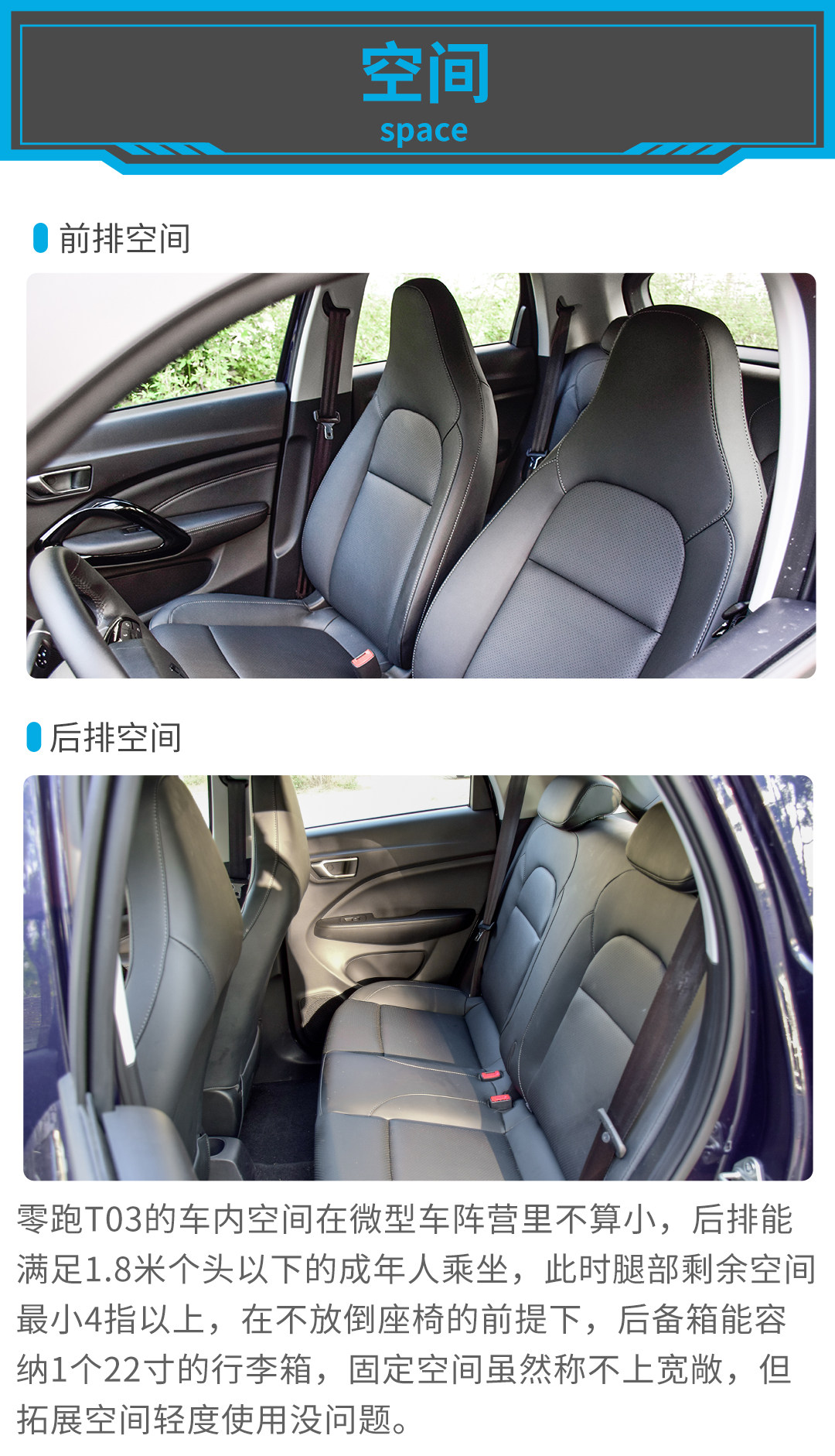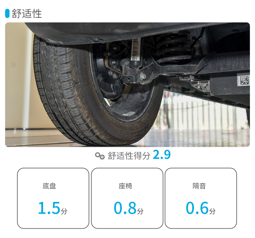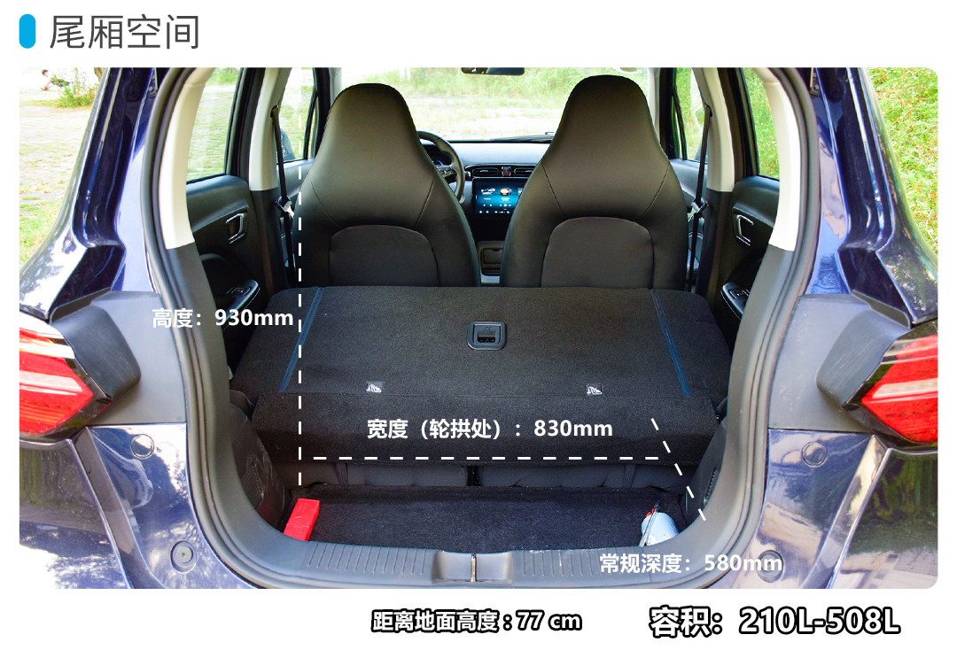 小结:空间对于一台微型电动车来讲并不是它的长项,但不错的后排空间表现以及多处储物格的设计提高了用车的便利性,只不过前排一体式运动座椅的造型一定程度上影响了后排的前方视野,好在有全景天窗的加持,让车内不会太压抑。