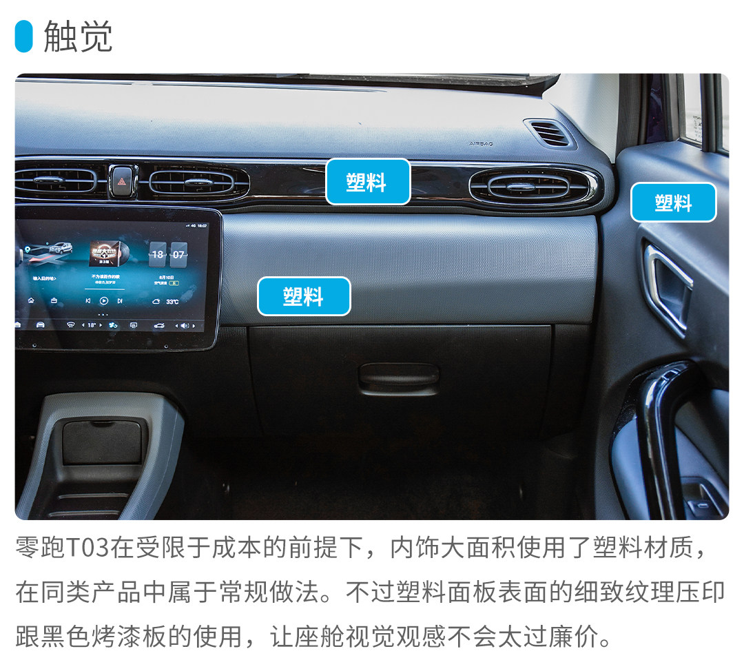 小结:零跑T03同样在车内使用了大量的硬质塑料包裹,不过椭圆形的空调出风口、钢琴烤漆饰板的拼接和皮质方向盘等细节的处理,让车厢的廉价感得以弱化,再加上大尺寸中控屏和液晶仪表的使用,驾驶舱的科技感也得到提升。