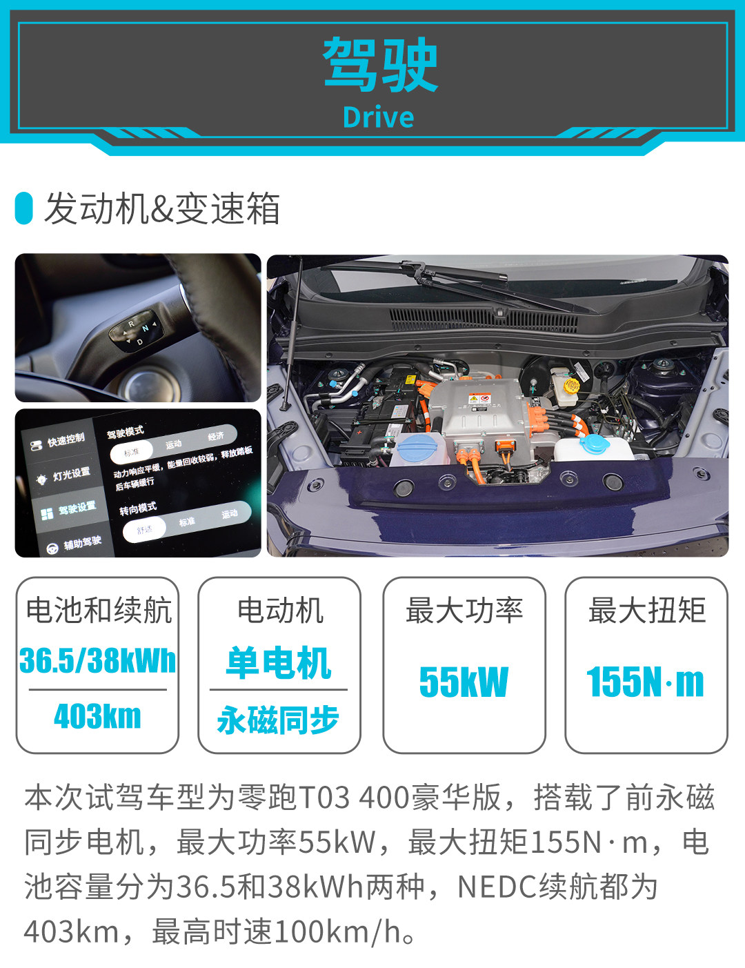 小结:受限于成本的考量,零跑T03跟其他竞品一样,中低配车型的配置比较简陋,自动驾驶辅助系统只有顶配才有,不过大多数功能并未开放,只有ACC巡航几项简单的辅助功能可以使用,不过零跑T03 403km的续航优势明显。