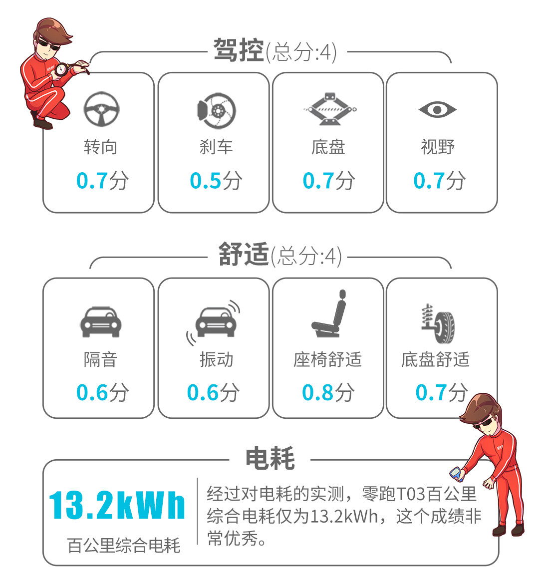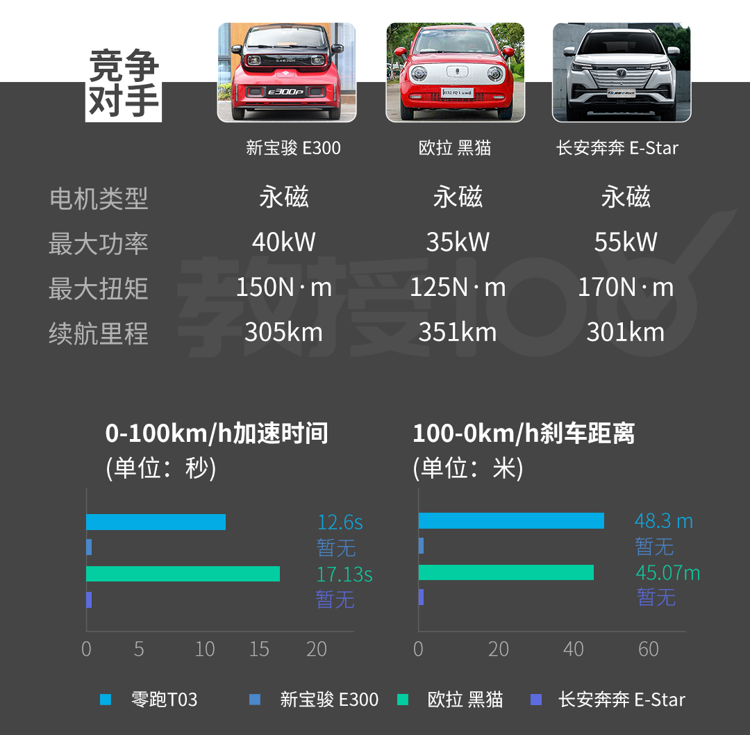 在实测过程中,零跑T03 0-100km/h的加速时间为12.6s,比官方宣称的14s要快一些,不过制动距离成绩比较差,已经达到48米的水平,对这类微型车而言,无论是加速和制动距离,其实都是它们的软肋,这也不是它们的强项,一分钱一分货的道理能够理解。