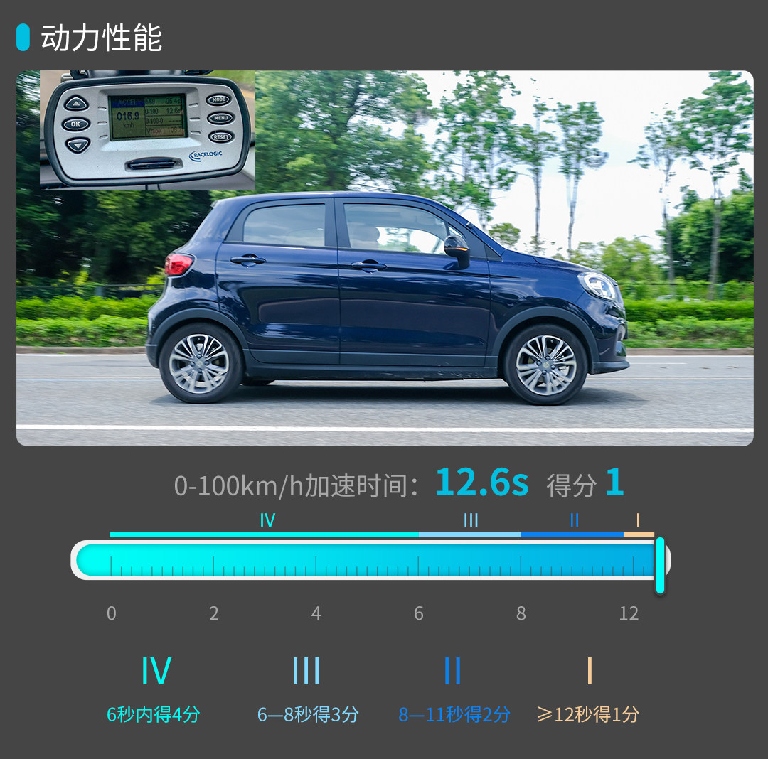虽然55kW的电机对这台微型车来讲动力并不弱,一脚电门到底也能获得不错的提速能力,但想体验刺激的加速感可能它的能力有限。