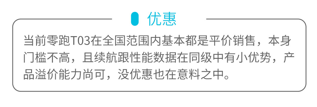 如果说欧拉R1、宝骏E200等车型只是能跑,那么零跑T03比它们更强的一点是可以跑得舒服,更像高一个级别的产品,虽然NVH做得不好,座椅也偏单薄,但在6万级的产品里,零跑T03的操控体验不输同级。