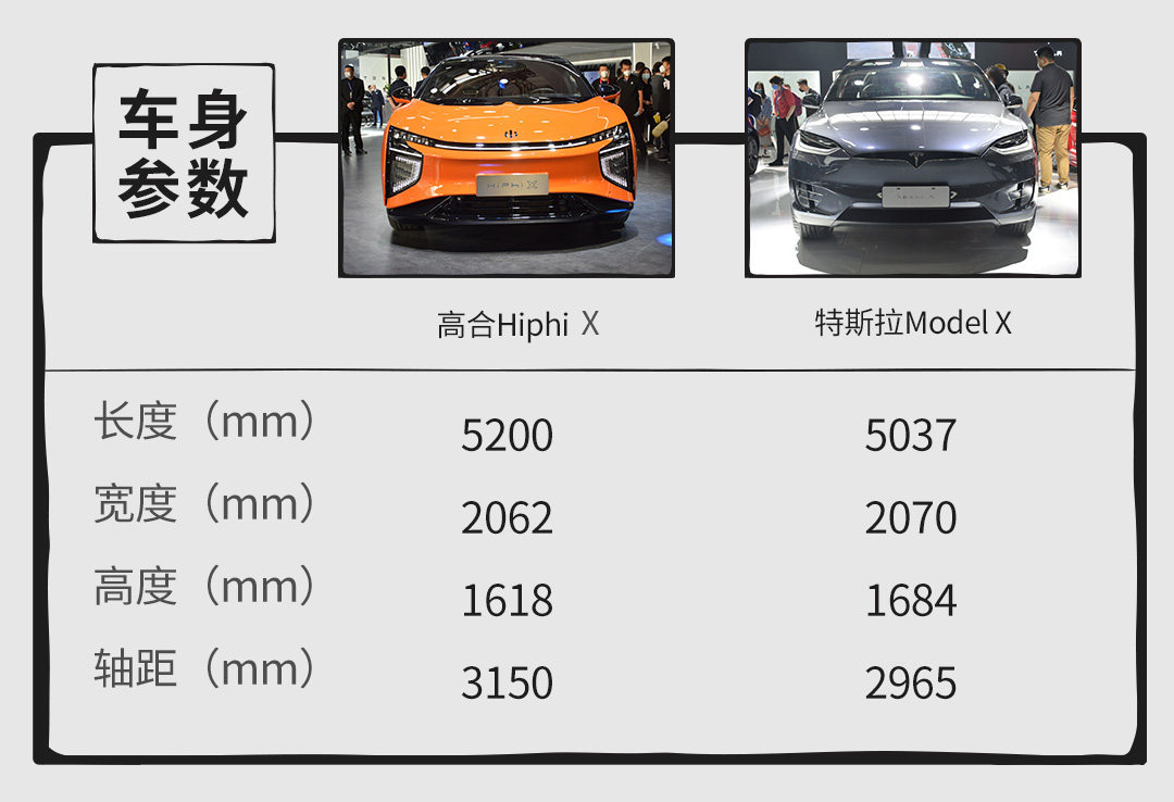 高合Hiphi X 和特斯拉Model X都是定位中大型SUV,但前者车长要比后者长163mm,轴距要长184mm,就是车宽和车高要比对方弱一些。从数据来看,车宽和车高相比后者分别短了80mm、56mm。