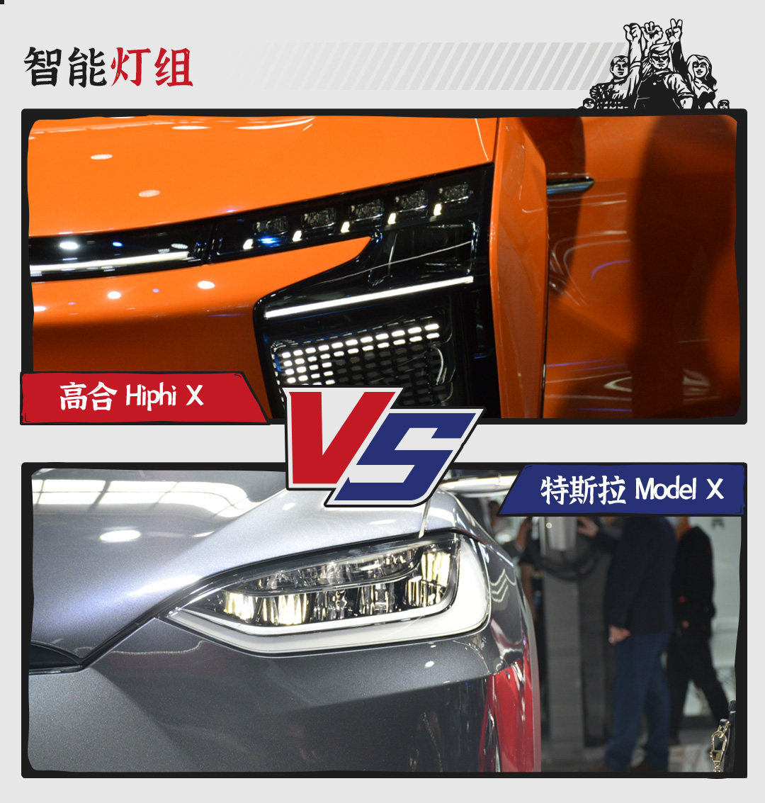 再反观特斯拉Model X,灯组设计得虽然很有神,但除了为这款车外在形象加分以及起到照明作用,再没有别的功能。与Hiphi X车型具备可交互功能的大灯组一相比,可谓黯然失色。
