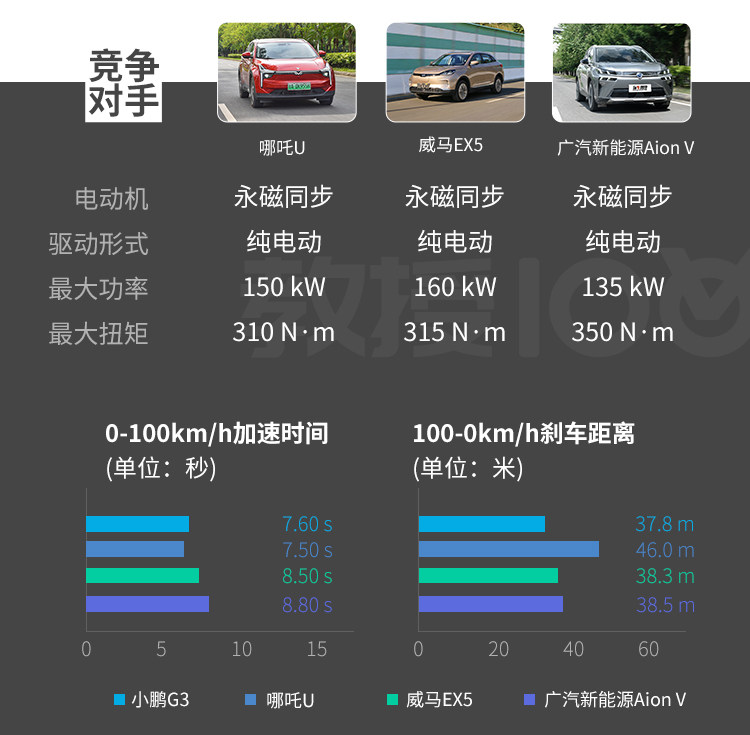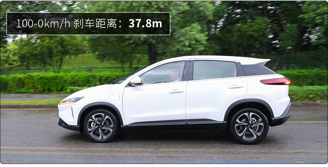 跑得快,还要刹得住、刹得稳。根据实测数据显示,全新款小鹏G3 100-0km/h刹车成绩是37.8m,相比同级威马EX5、哪吒U等对手,优势领先。当然,做出这样的成绩,其匹配的胎宽215mm、扁平率达到55的米其林轮胎功不可没。