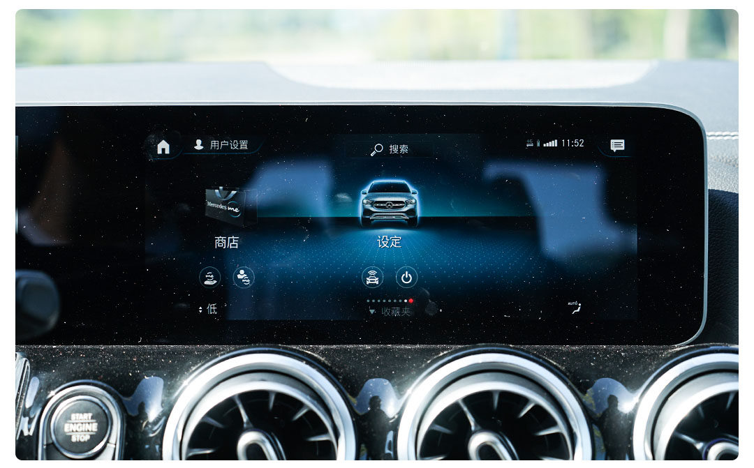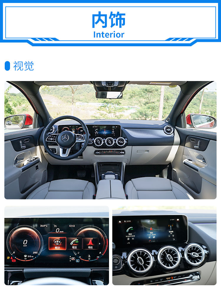 车厢内,第二代GLA采用了当前奔驰入门级车型的家族化设计语言,双联屏设计和银色圆形空调出风口设计使人一眼就可辨识出它作为奔驰车型的身份;全液晶仪表盘与10.25英寸多媒体触摸屏实现全系标配,是GLA车厢科技感的主要来源。