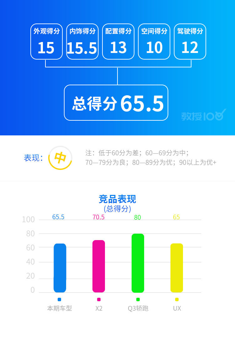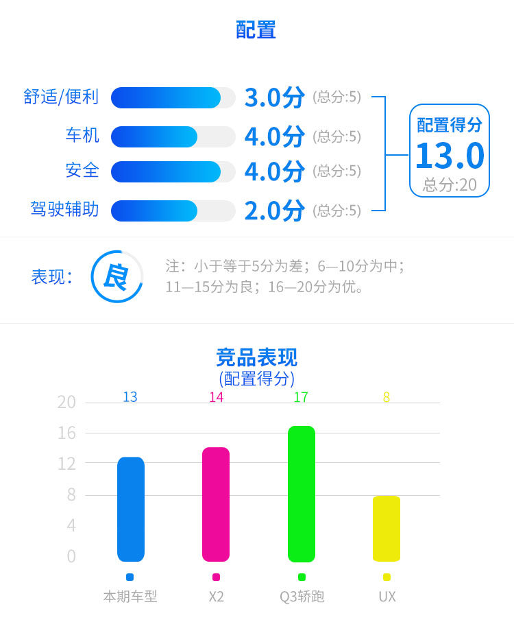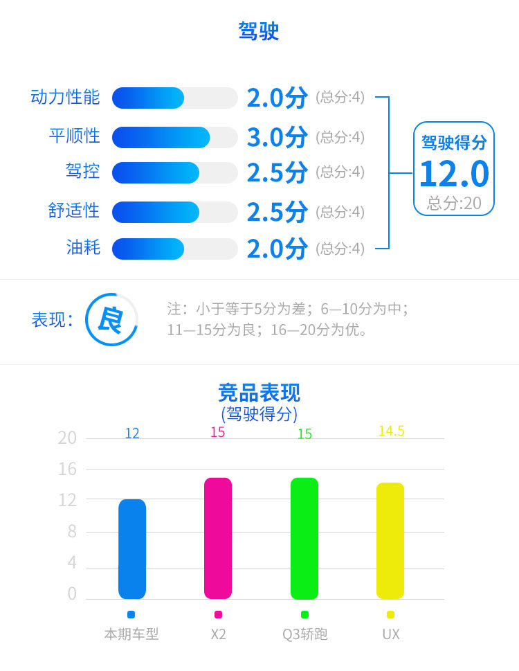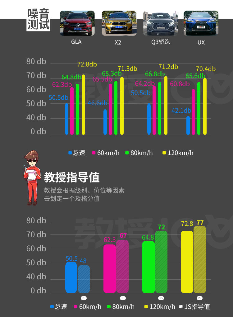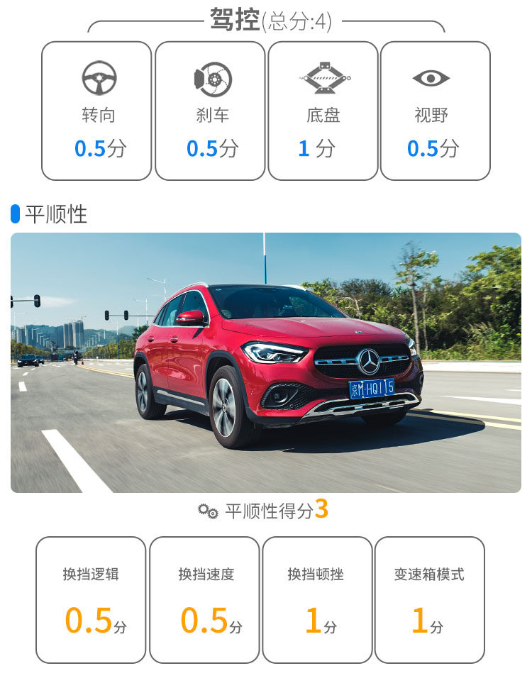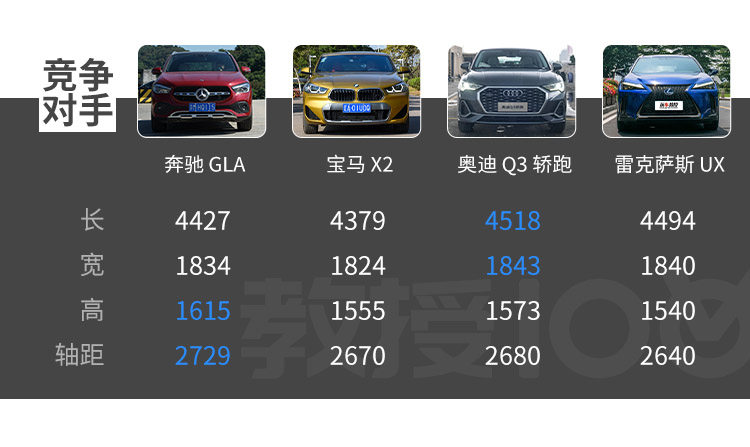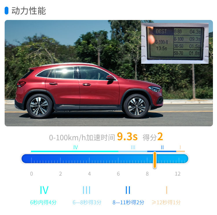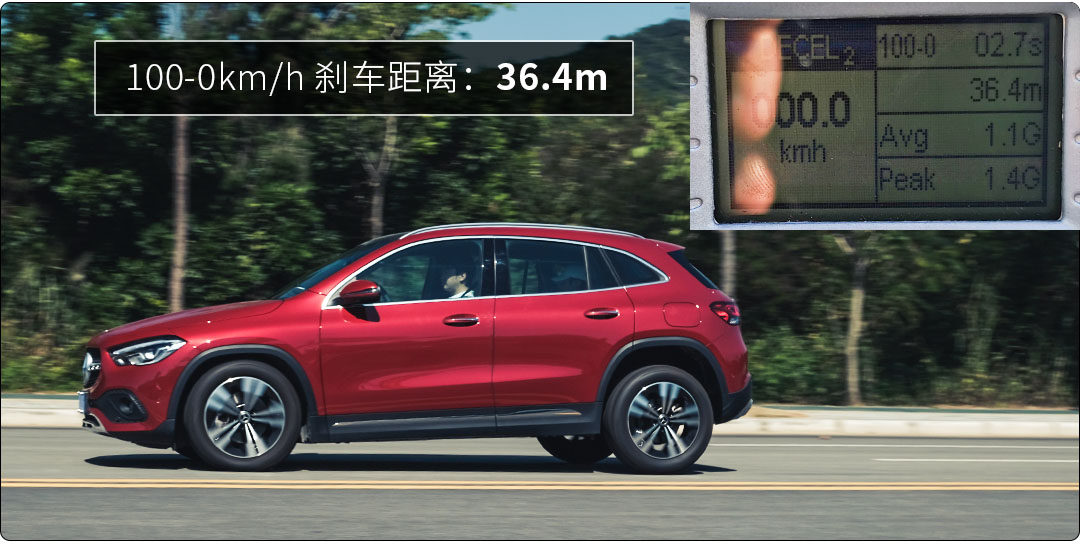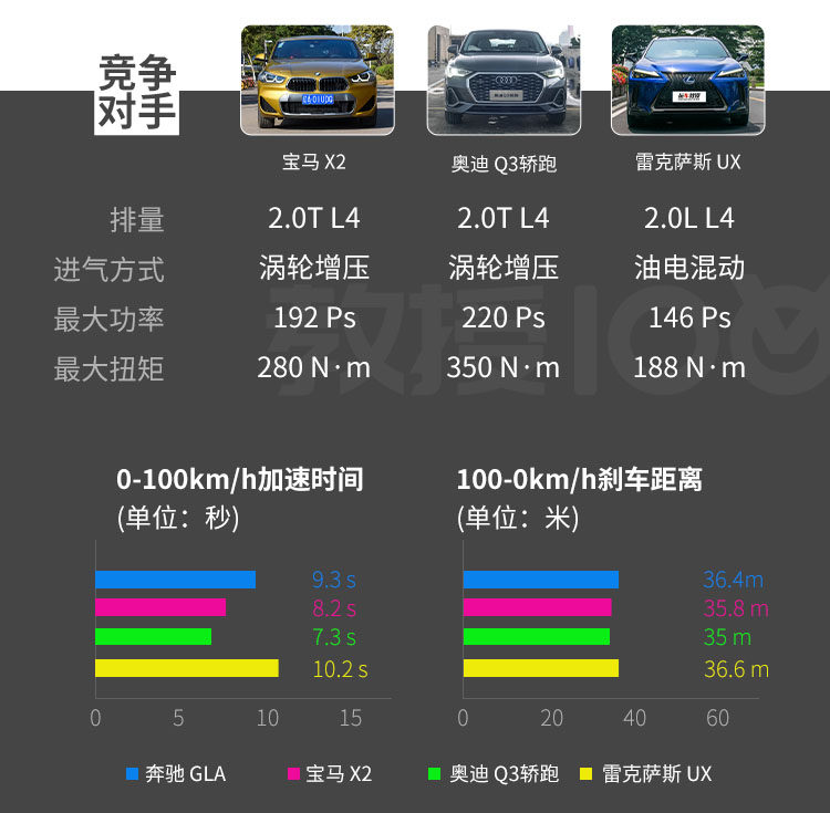 当然,与宝马X2、奥迪Q3轿跑这样的竞争对手相比,第二代GLA的1.3T动力性能完全不具优势,从0-100km/h的加速成绩方面就可看出它与竞争者之间比较明显的性能差距。