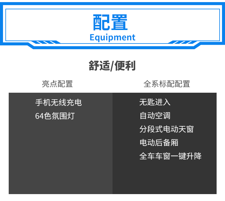 在舒适与便利配置方面,第二代GLA实现了无匙启动与电动后备箱、分段式电动天窗等实用配置的全系标配,但无匙进入与64色氛围灯、前排手机无线充电等配置则需要额外选配。