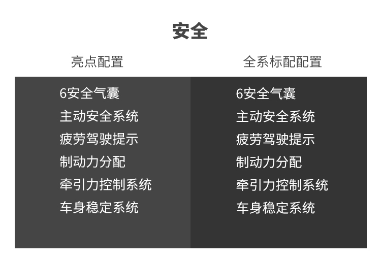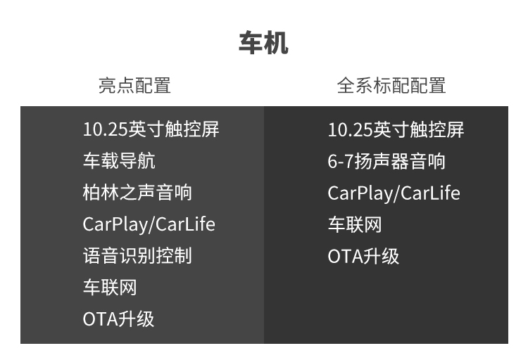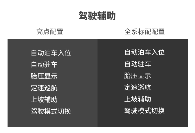 辅助驾驶配置则更加“朴素”,除全系标配的自动泊车、自动驻车和普通定速巡航等基础功能之外,车道保持辅助、并线辅助等高档功能均未提供,而全速自适应巡航功能则仅在顶配车型身上以选配项目提供。