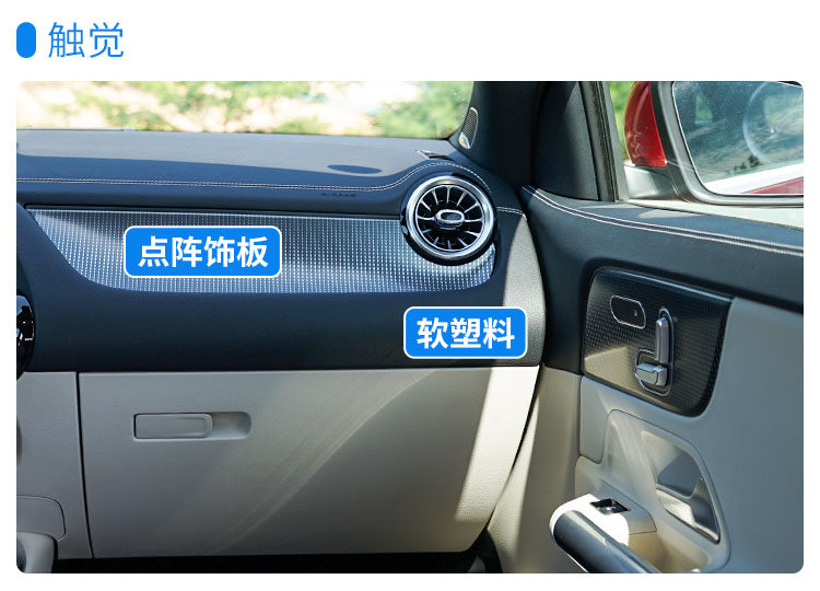 第二代GLA的内饰各部件做工优秀,装配水平也比较高,各部件之间严丝合缝,没有找到明显的内饰部件松动情况。但作为入门级车型,在内饰用料方面当然就稍显不足了,较其他更高等级的车型采用了更多的软/硬塑料部件。