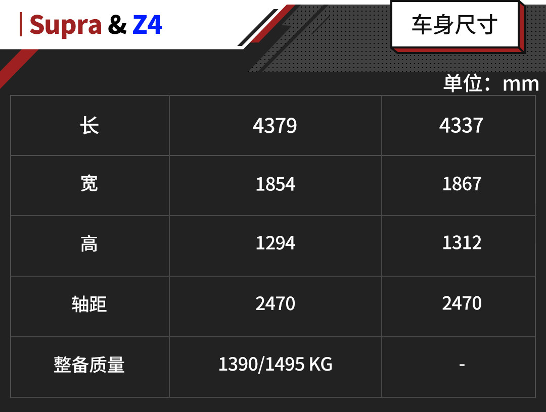 车身尺寸方面,丰田Supra的长宽高是4379*1854*1299(毫米),轴距是2470毫米;而宝马Z4则是4336*1867*1322(毫米),轴距是2470毫米;除了轴距,Supra更长、更窄也更低矮。