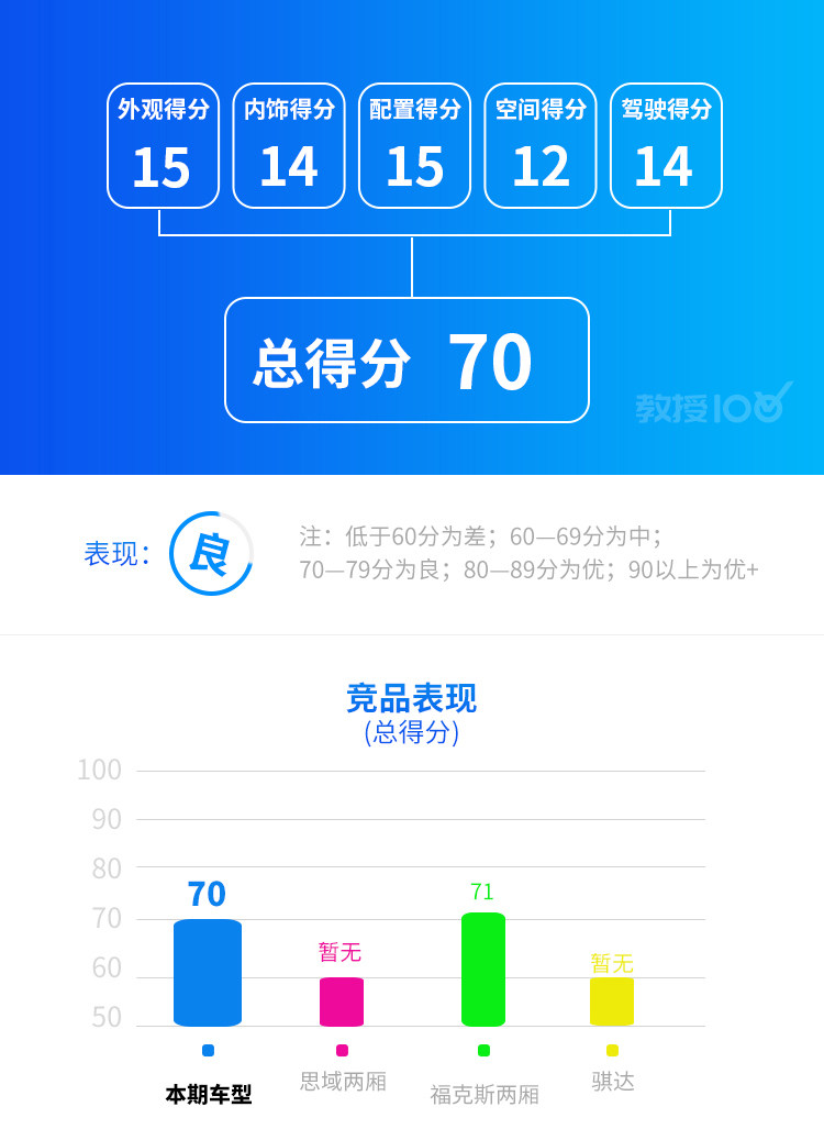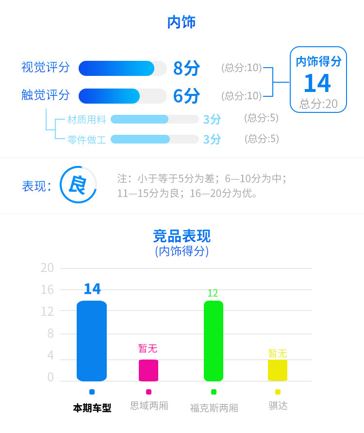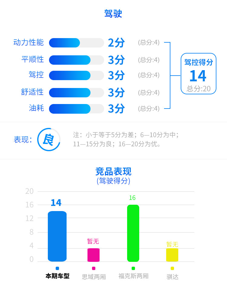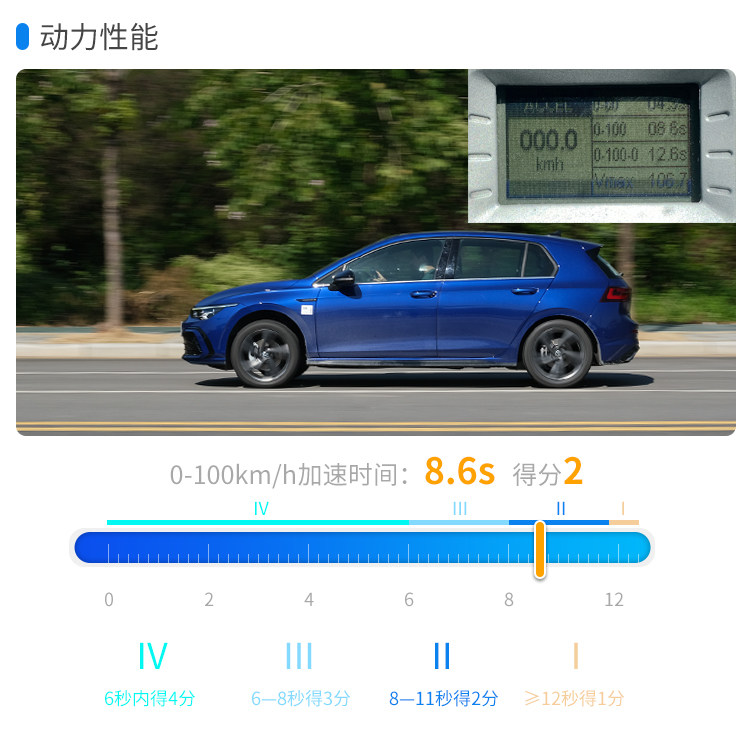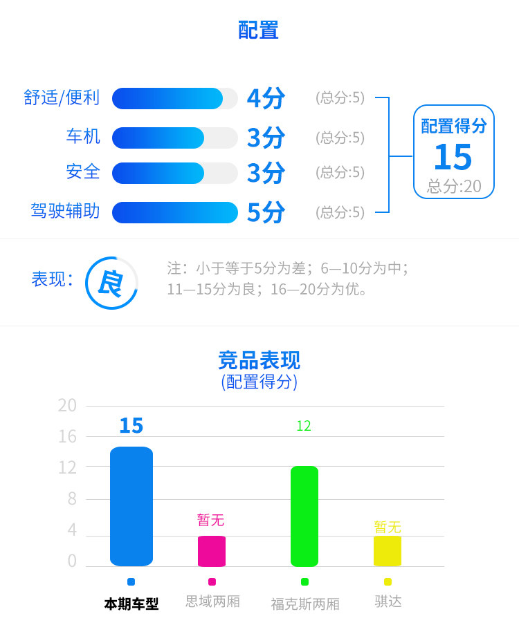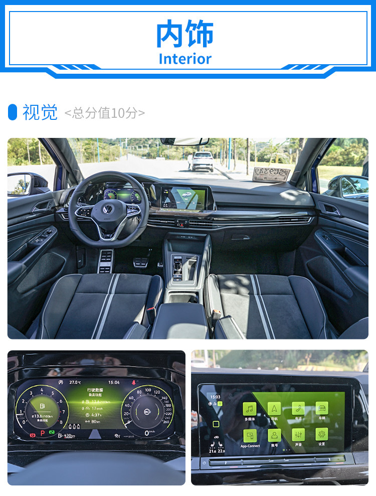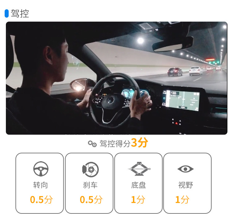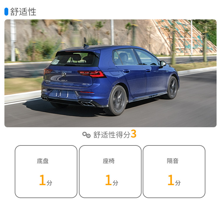 由于是顶配+选装,高尔夫的舒适性和驾驶辅助配置最为突出,能拿到比较不错的分数,安全配置表现比较厚道,车机表现中规中矩。
