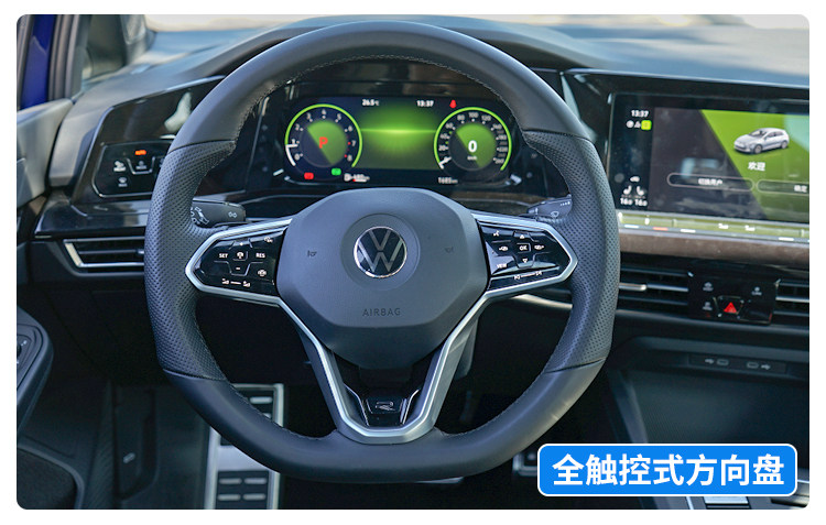 方向盘按键也是全触控化,并且具备按压震动反馈,平底设计,三九点方向有点平,握感和运动感都非常强,值得注意的是高尔夫的方向盘造型跟旗舰途锐的方向盘是同款,但这个全触控的方向盘是顶配车型专属。