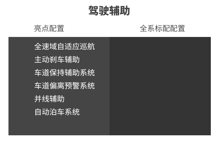 驾驶辅助配置可以给到满分,因为测试车基本是满配,所以车道保持、并线辅助甚至是自动泊车都有配备。值得注意的是:车道偏离预警、车道保持、并线辅助、交通标志识别、主动刹车、全速自适应巡航和自动泊车都仅在顶配车型出现,入门版没有配备驾驶辅助配置,其余车型只配备定速巡航。