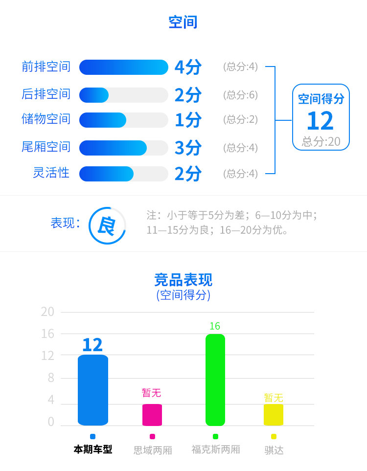 八代高尔夫的前排基本是没什么问题,但后排空间对比同级别来说没什么优势,也低于平均值,所以给到的分值不多,受车身尺寸的影响,储物空间和尾厢空间都中规中矩。
