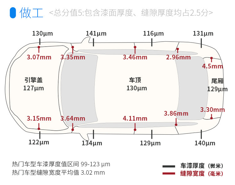大众品牌的车漆还是一如既往地厚,基本维持在130μm左右,但有部分板件的间隙偏大,达到了4mm,而且车漆和间隙控制还有提升空间,估计是前期批次的原因。
