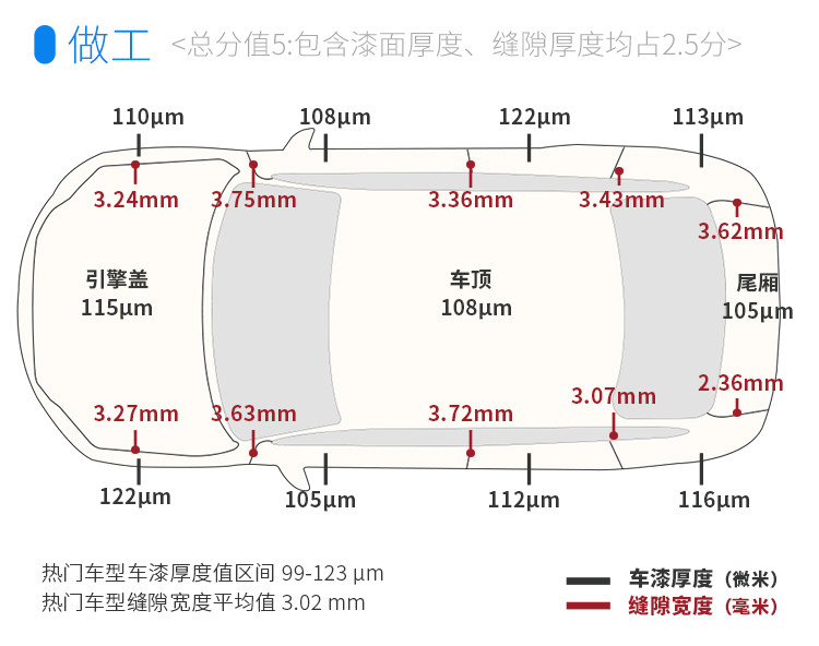 新款E级的车漆是比较薄的,基本在110μm左右浮动,但整体控制得比较均衡,车漆质感也非常出色;钣金间隙中规中矩,左右对称均匀,但整体有一定误差。