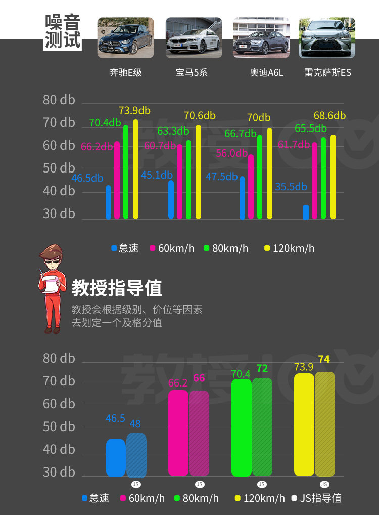 不过经过我们实测发现,新款E级的隔音表现跟预期有点差距,怠速时车内能听到引擎声,虽不算绕耳,但不算安静,中高速时的噪音表现都没有太大惊喜,跟竞品相比差距有点明显,数据详情可看下文。