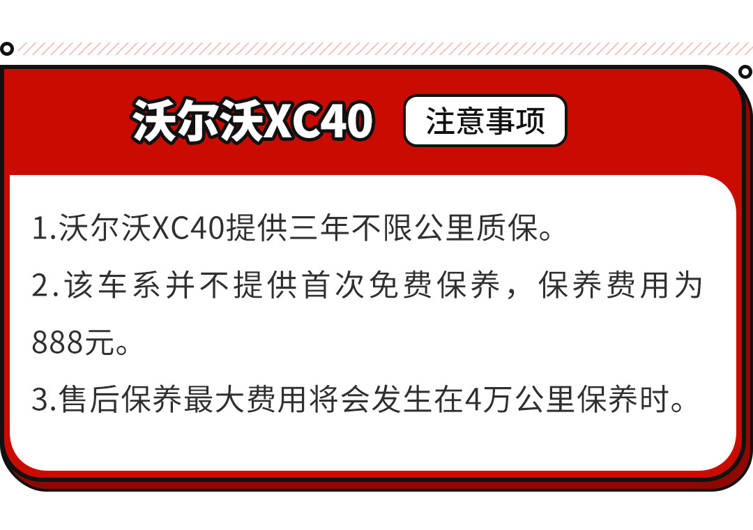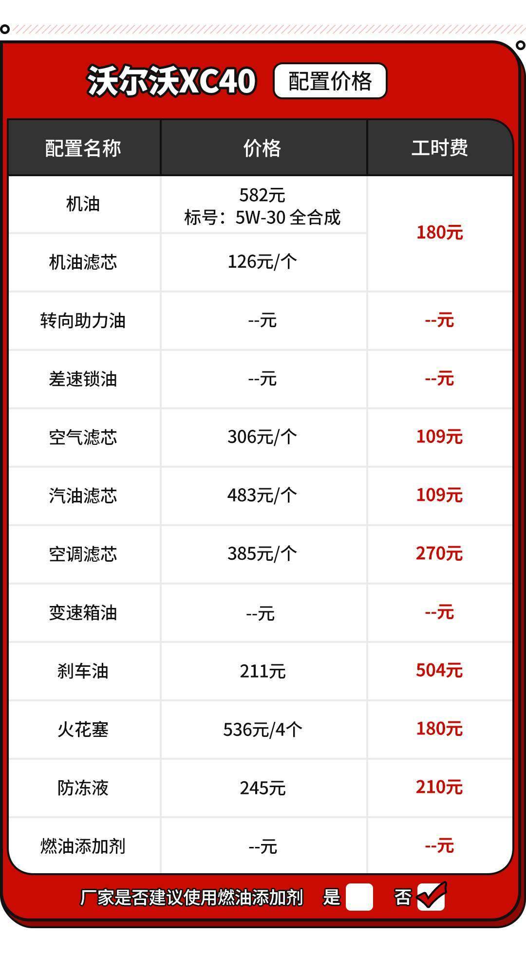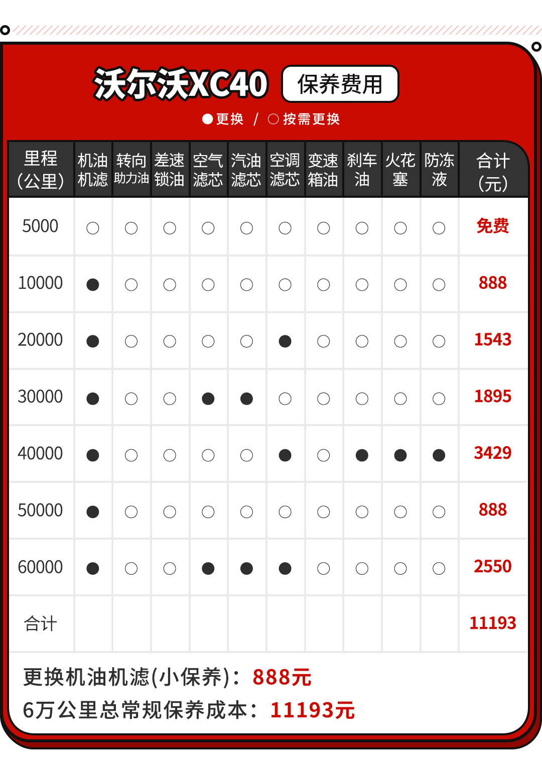 需要注意的是,XC40的首保并不是免费的,这一点是和大多数的豪华品牌一样,而以6万公里为计算,整个保养周期最大的一笔费用将会发生在4万公里的时候。