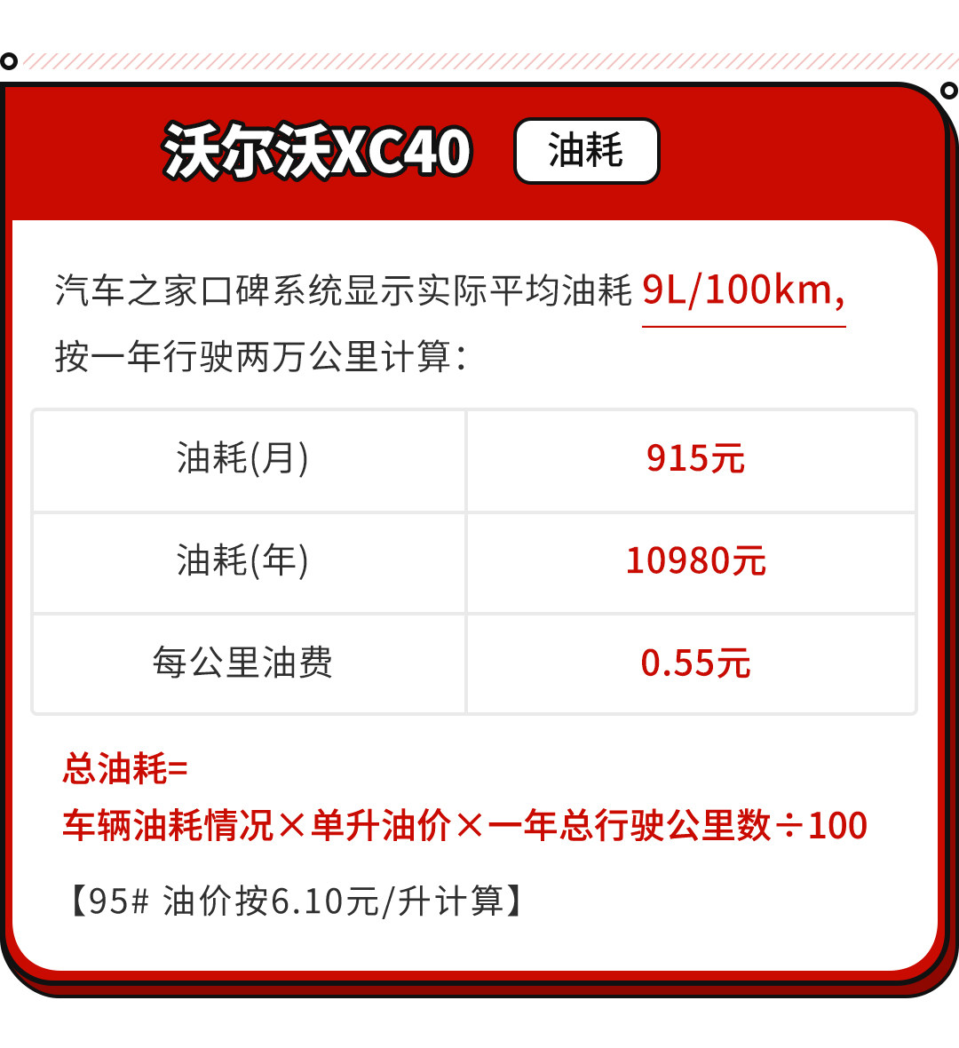 油耗方面,参照2.0T的动力,XC40每百公里9L的油耗并不会过高,只是在油品方面需要加95#汽油,这一点让用车成本会略微提升。不过综合算下来,每个月花费915元,平均每公里0.55元,这一点买买君认为表现还是不错的。