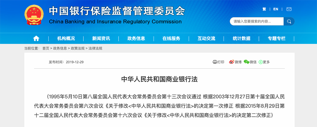 可惜的是,买买君在翻查银监会2019年底所发布的《中华人民共和国商业银行法》中,发现第四章第五十条规定: