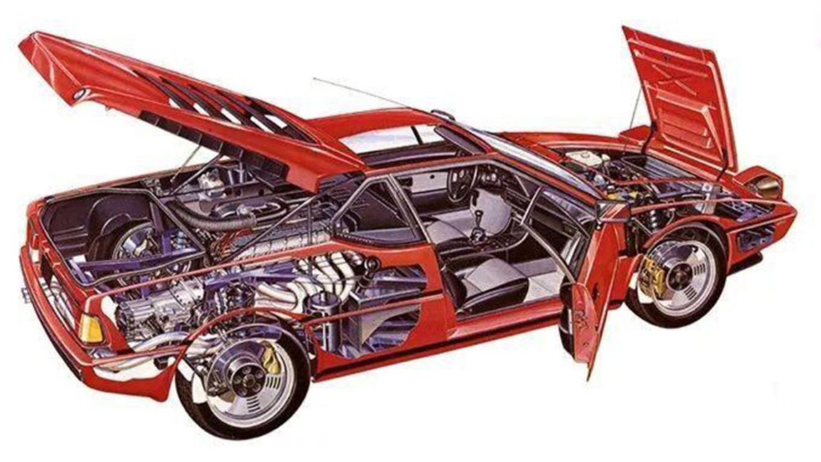 除此之外,宝马M1的全车设计工作还由多家合作方一同完成,例如当时宝马对于中置后驱的车身布局并没有太多的研究,所以便将底盘及车身管状结构的研发交给了兰博基尼,而宝马自己则提供了赛车规格的3.5L直列6缸发动机,至于变速箱则是由ZF(采埃孚)提供。
