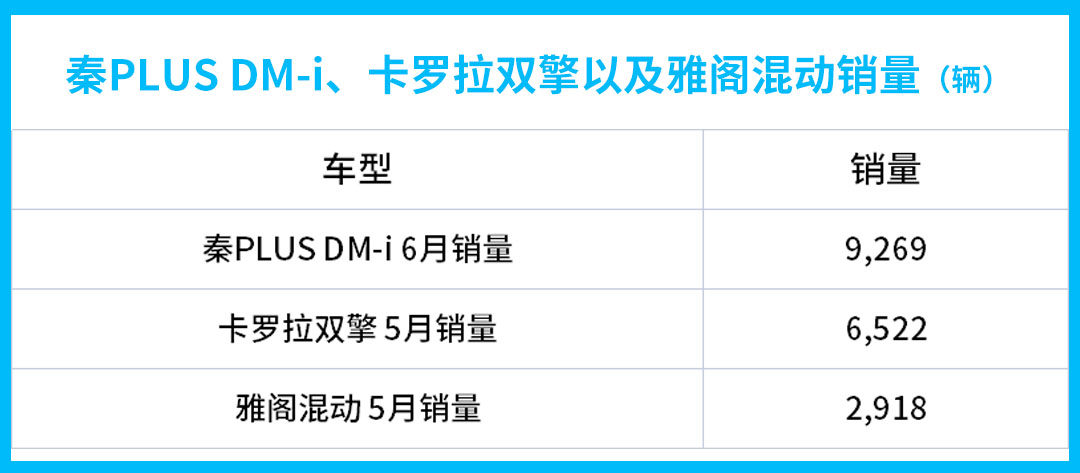 相关数据显示,在刚刚过去的6月份,搭载了“比亚迪DM-i超级混动技术”的“秦PLUS DM-i”车型,共斩获了9,269台销量。要知道,丰田的卡罗拉混动车型,在5月份“只”卖了6,522台;而本田雅阁混动在5月份的销量也不过2,918台。