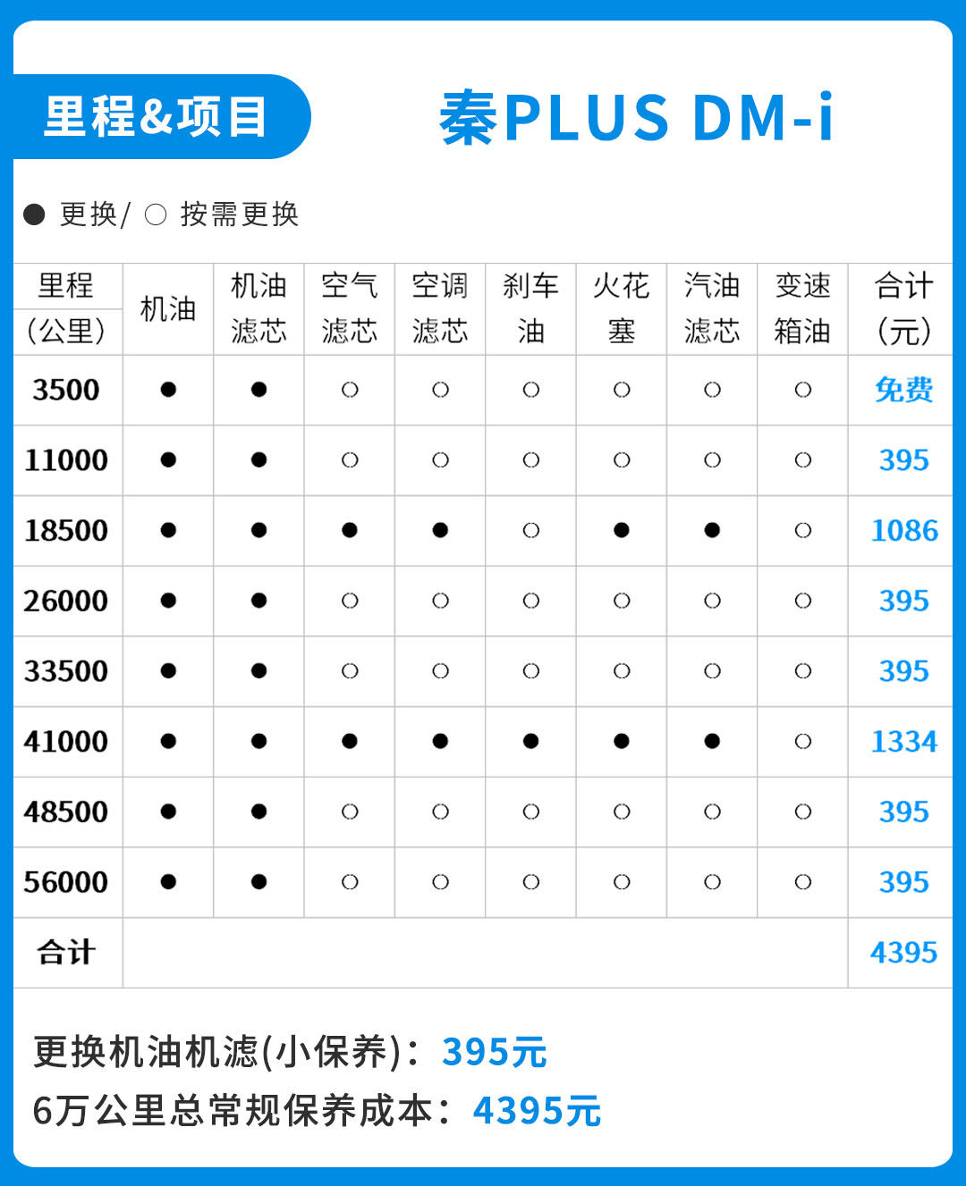 根据厂家建议,秦PLUS DM-i的保养周期为每7500公里一次,其中更换机油机滤的小保养费用为395元,大保的费用为1086元。