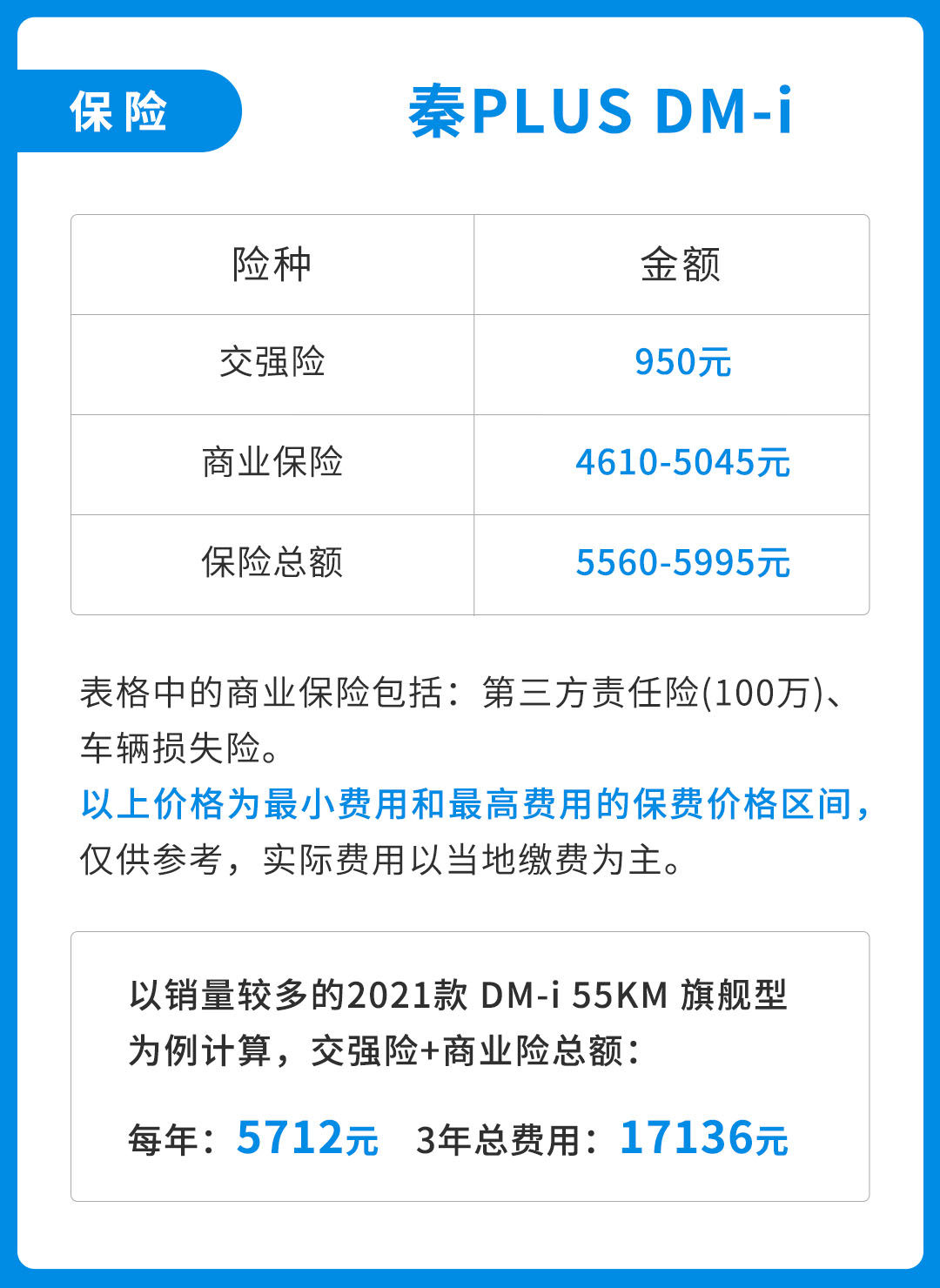 秦PLUS DM-i的官方指导价为10.58-14.58万元。保险费用因地区、车价不同而不同,以广州地区为例,入门级车的保险费用为约5560元/年,顶配车型的保险费用约5995元/年。